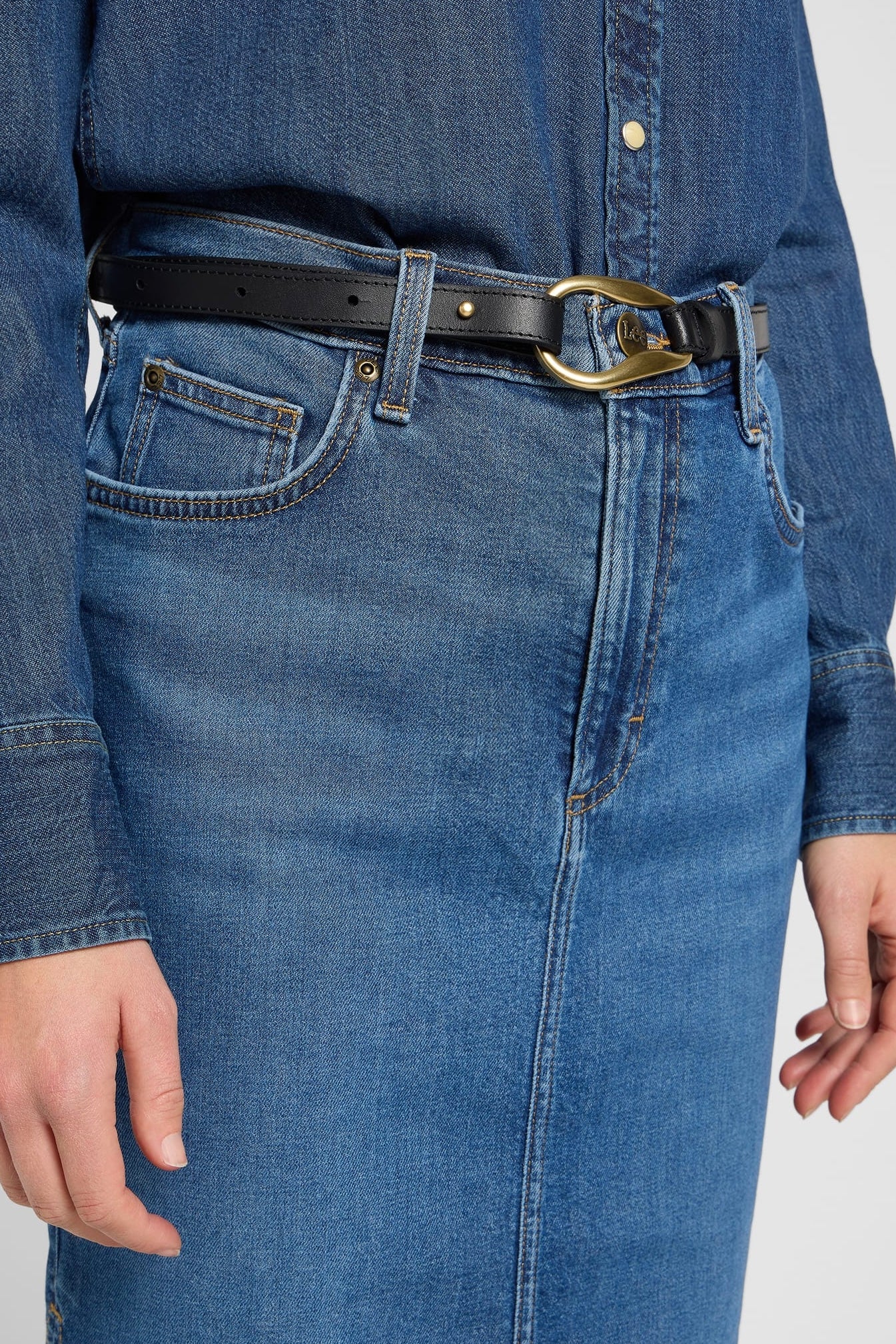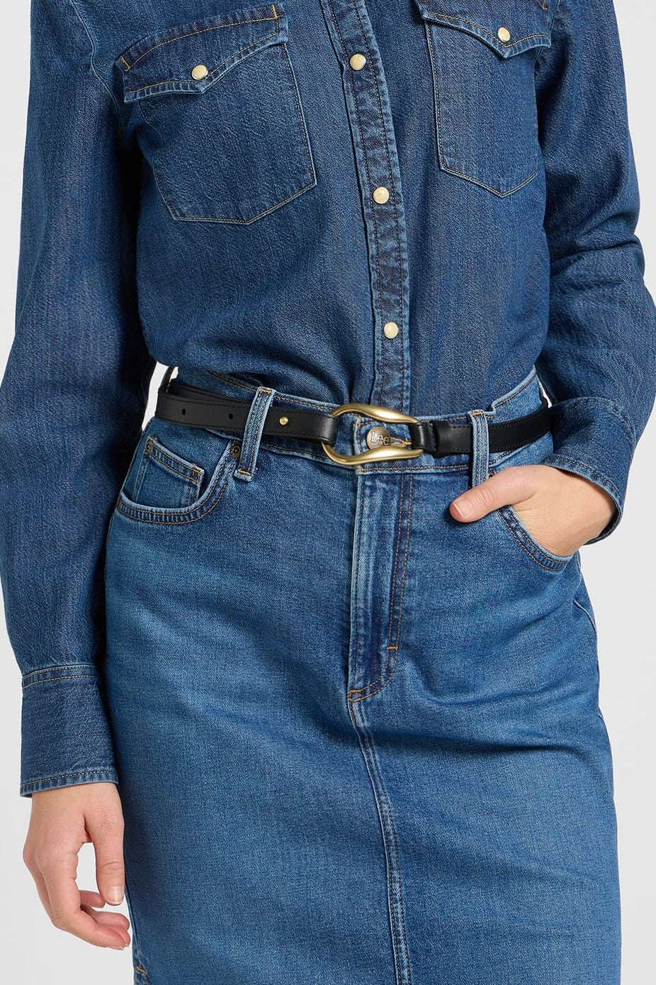 - חגורה אלגנטית עם אבזם גלי מעוגל בגימור זהב תוספת מושלמת לכל לוק שדורש גימור מדויק.