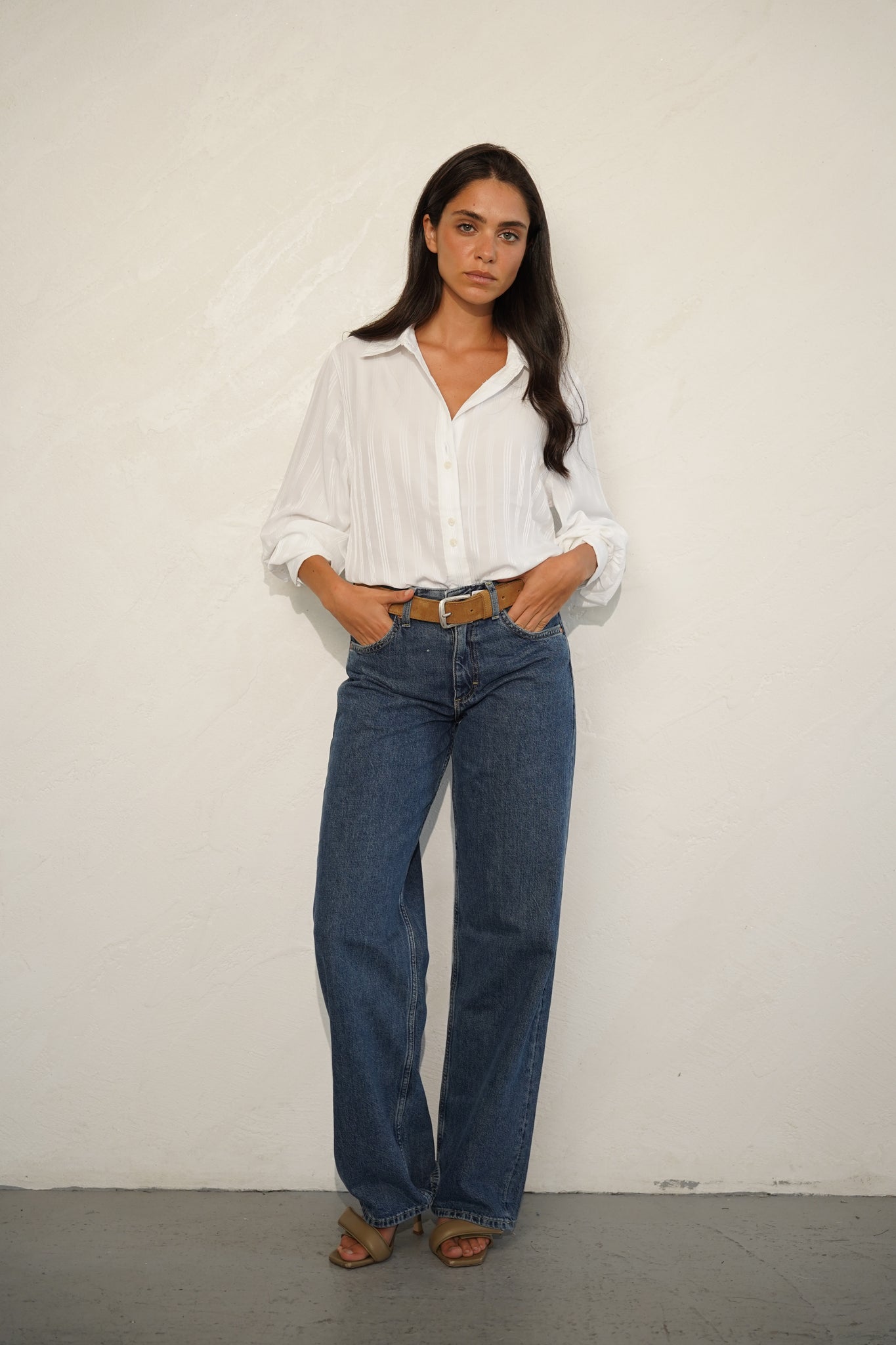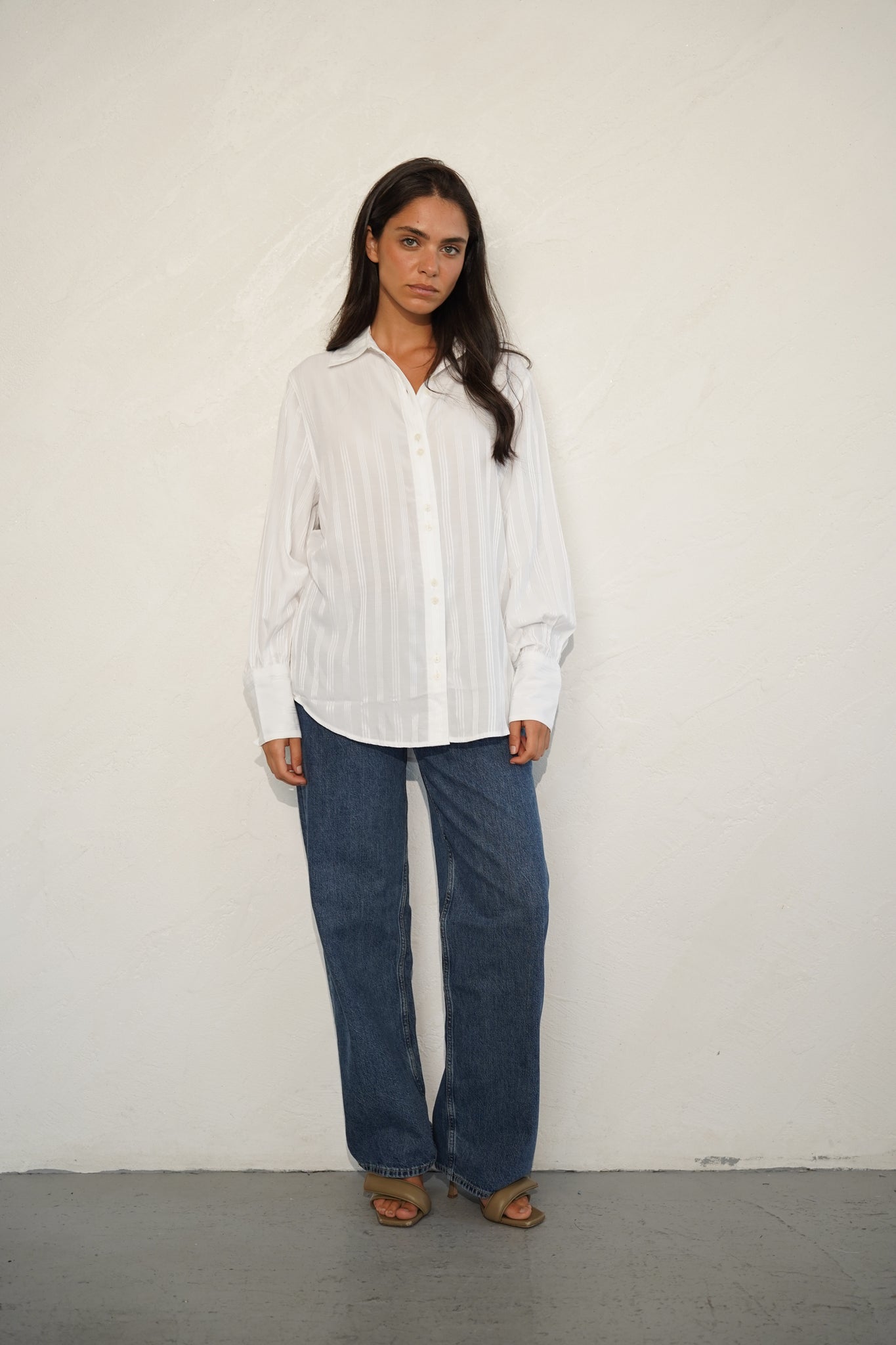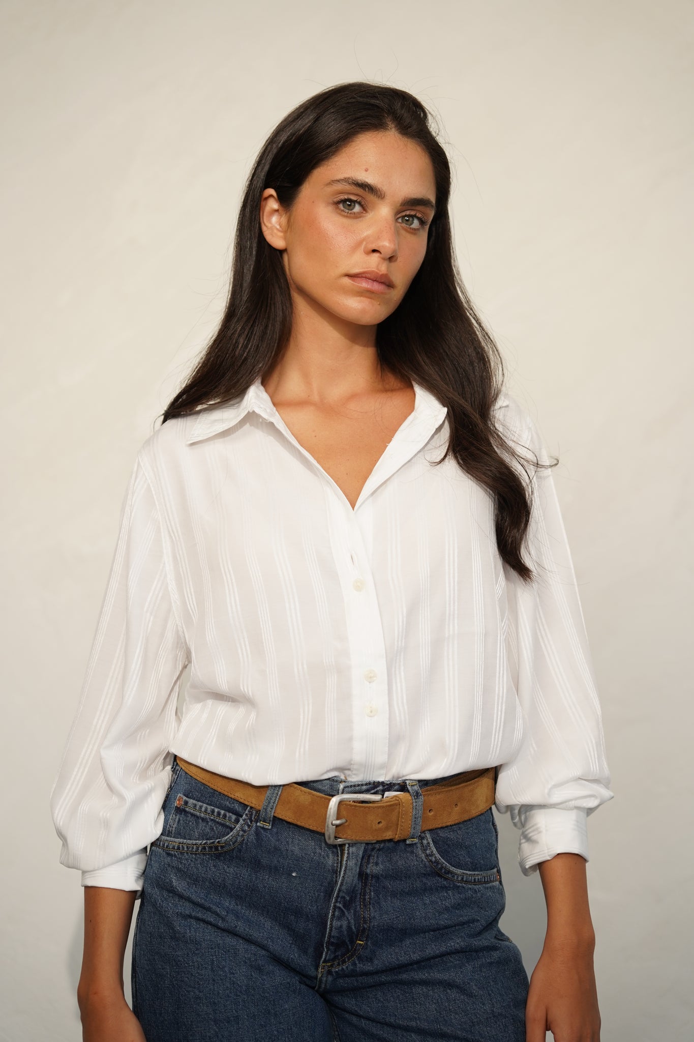 - חולצה מכופתרת לבנה בגיזרה משוחררת עם צווארון קלאסי משלבת מראה נשי ואלגנטי שמתאים ללוק יום־יומי מחויט או קז’ואלי מתוחכם.
