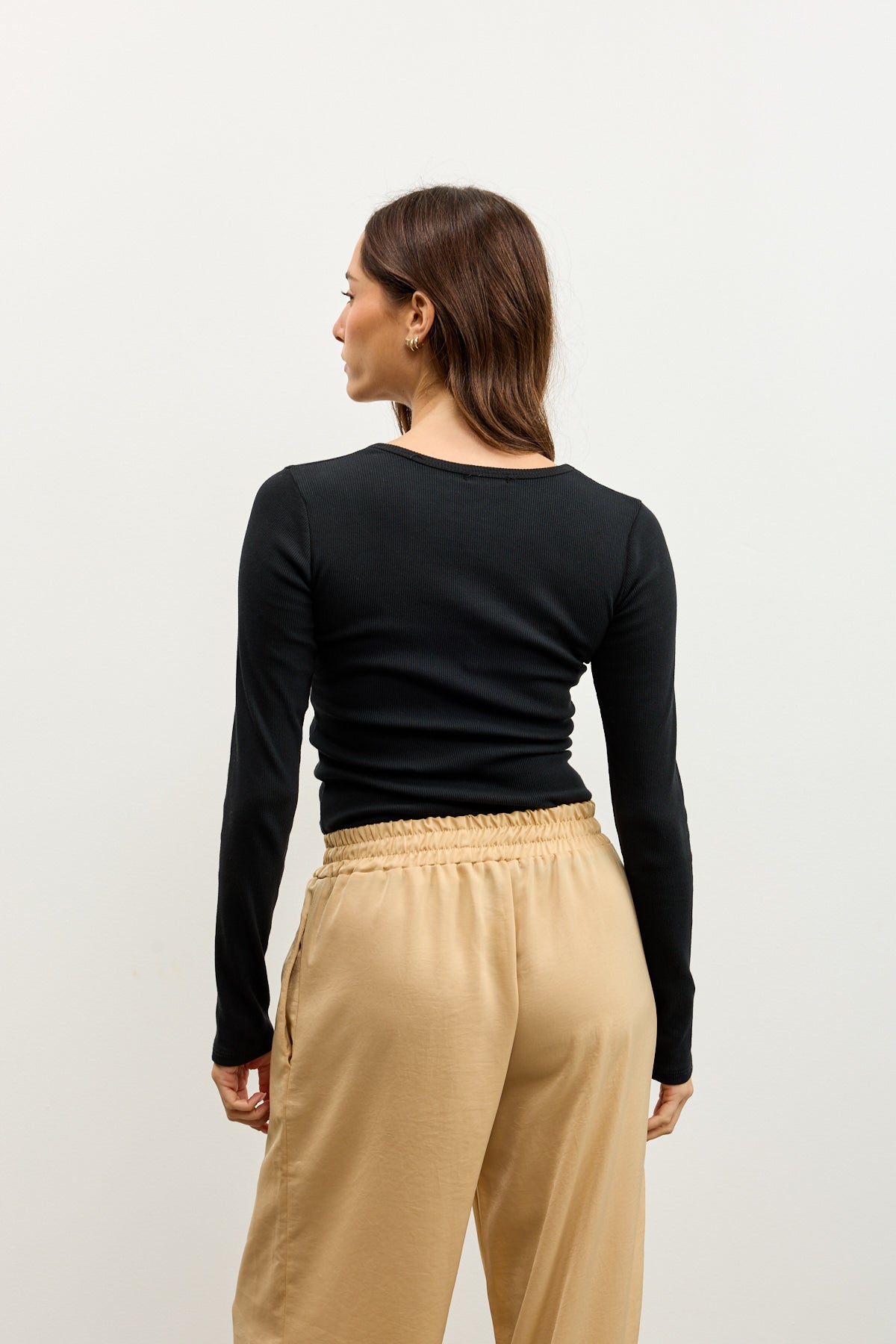 חולצת בייסיק ריב המיוצרת באיטליה מכותנה משובחת. הגזרה הקרובה לגוף והאורך המדויק עד קו המכנס מעניקים מראה נקי ומחמיא. מושלמת לשילוב עם ג'ינס, מכנסיים רחבים או חצאית - פריט שימושי שתמיד כיף ללבוש