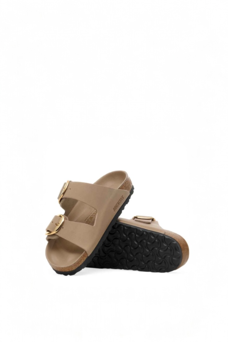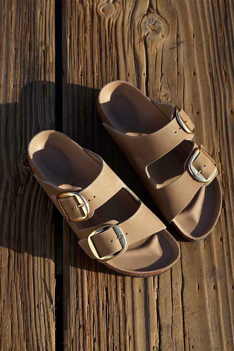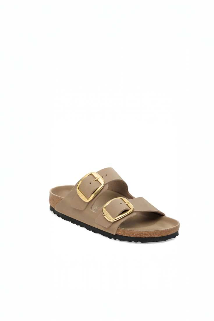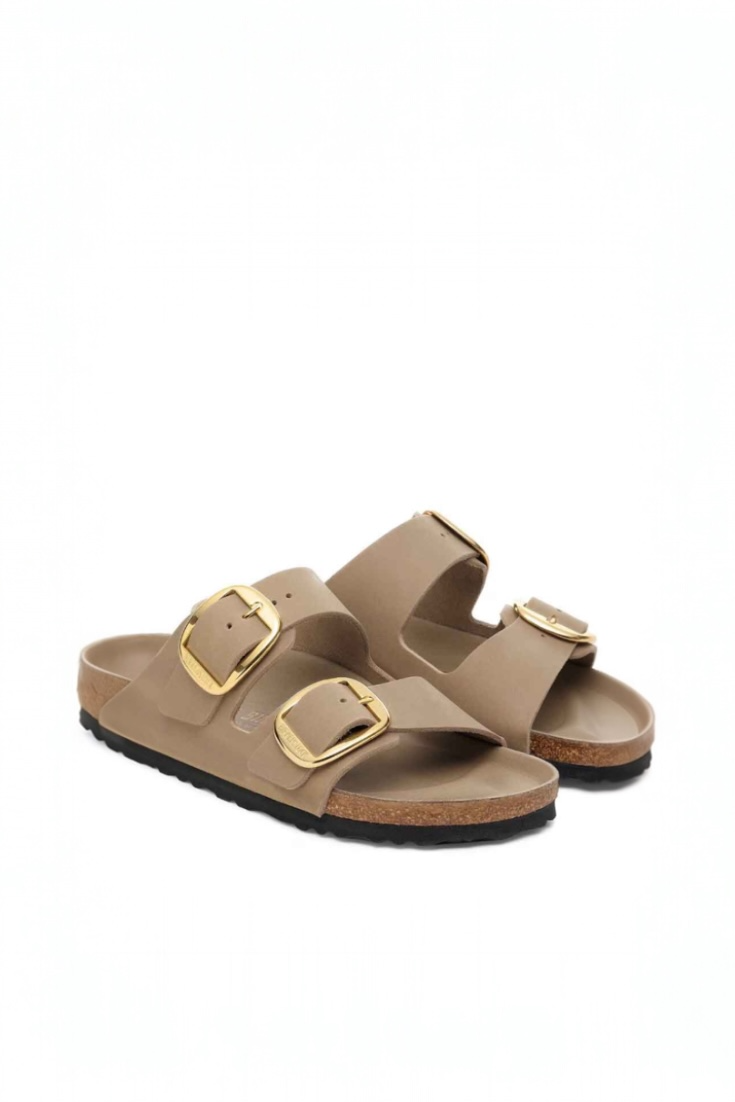 סנדלי בירקנשטוק אריזונה ביג באקל בגוון טאופ בז' עם אבזמים זהובים מרשימים.
