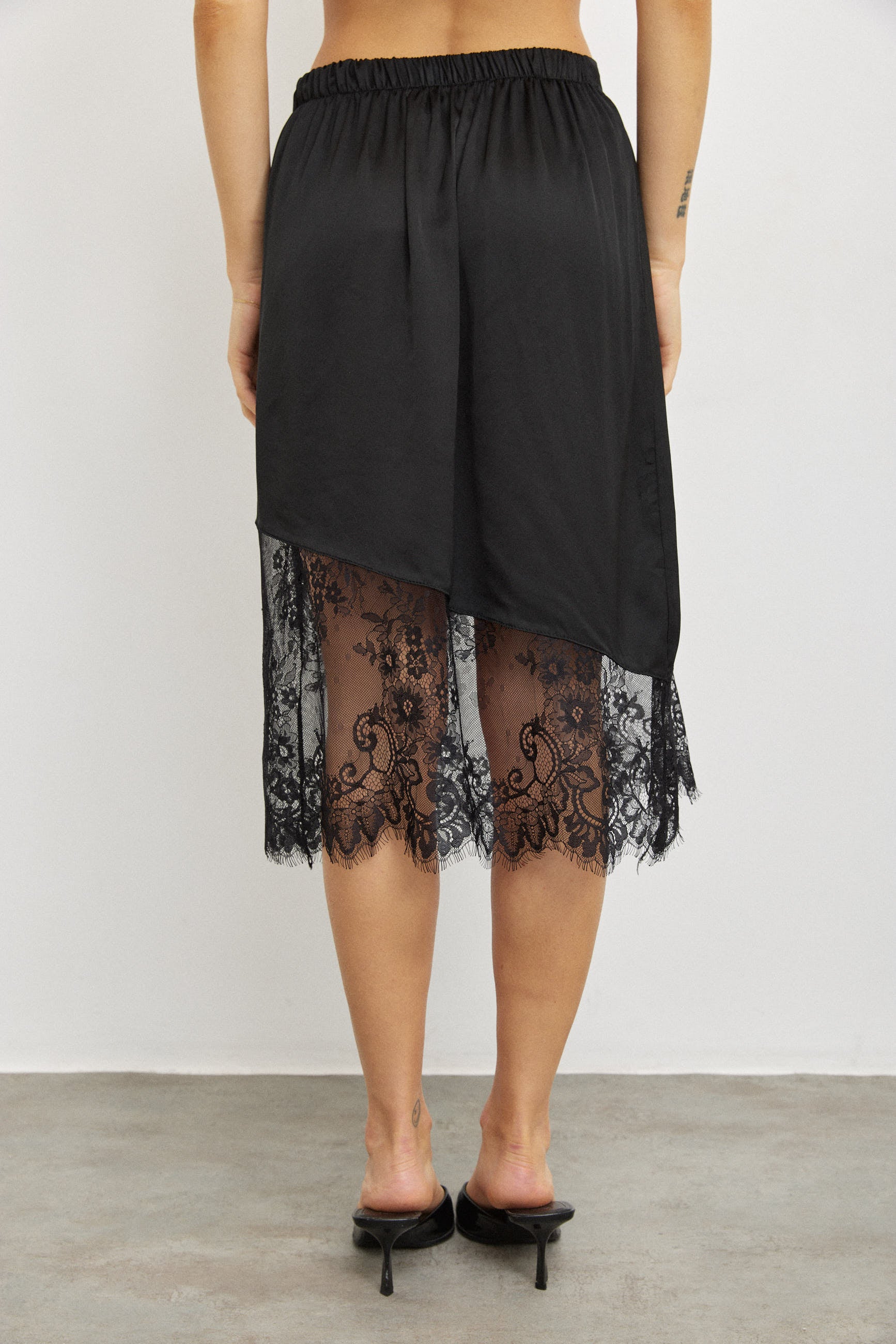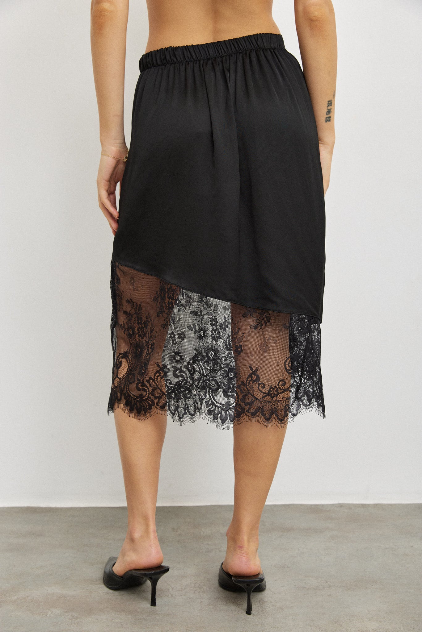 החצאית בגזרה נקייה ומחמיאה, עם סיומת תחרה עדינה שמוסיפה מראה נשי ואלגנטי - בלי להתאמץ.