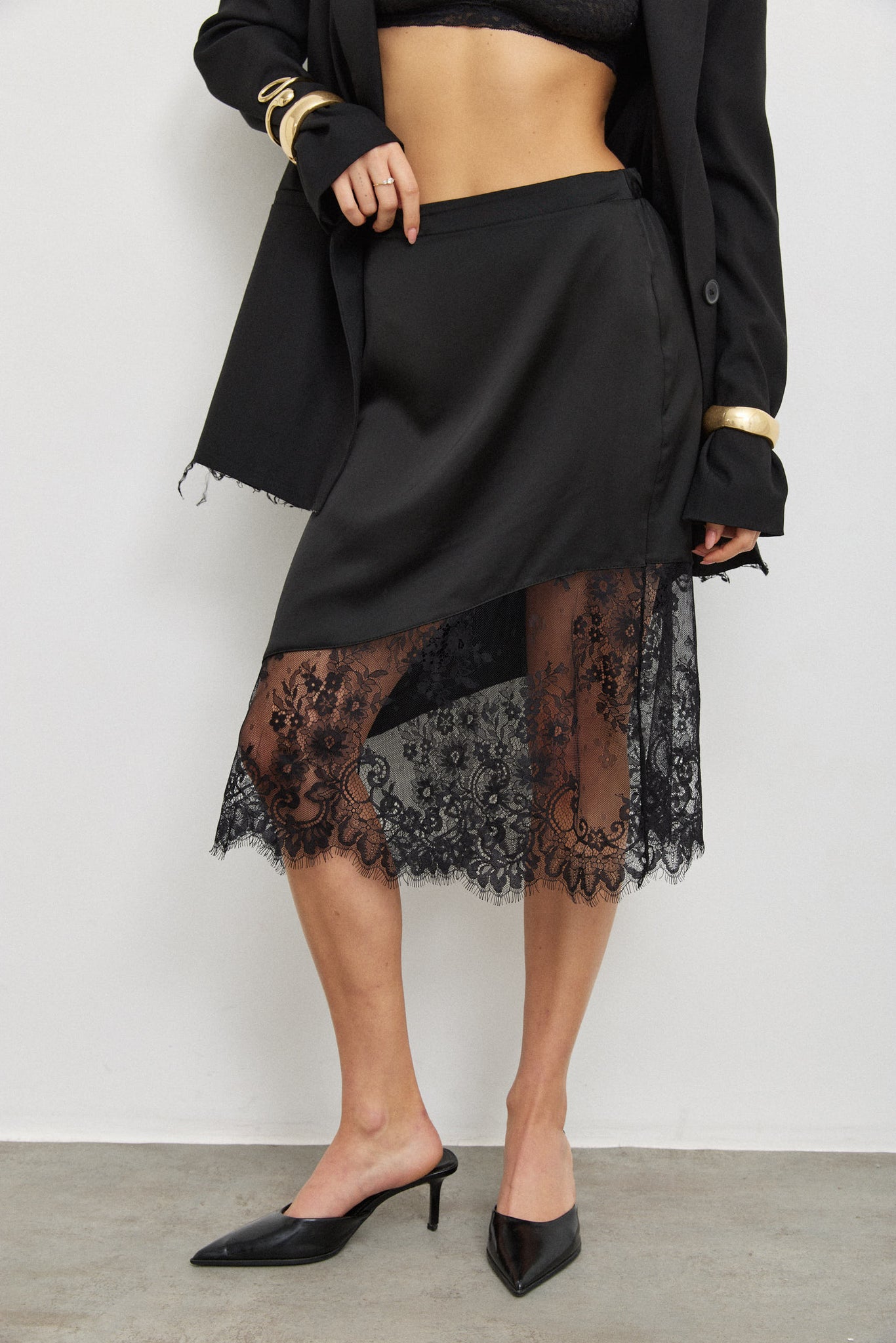 חצאית מידי בשילוב תחרה, מיוצרת באיטליה, היא פריט על זמני שמכניס עומק וסטייל לכל לוק.