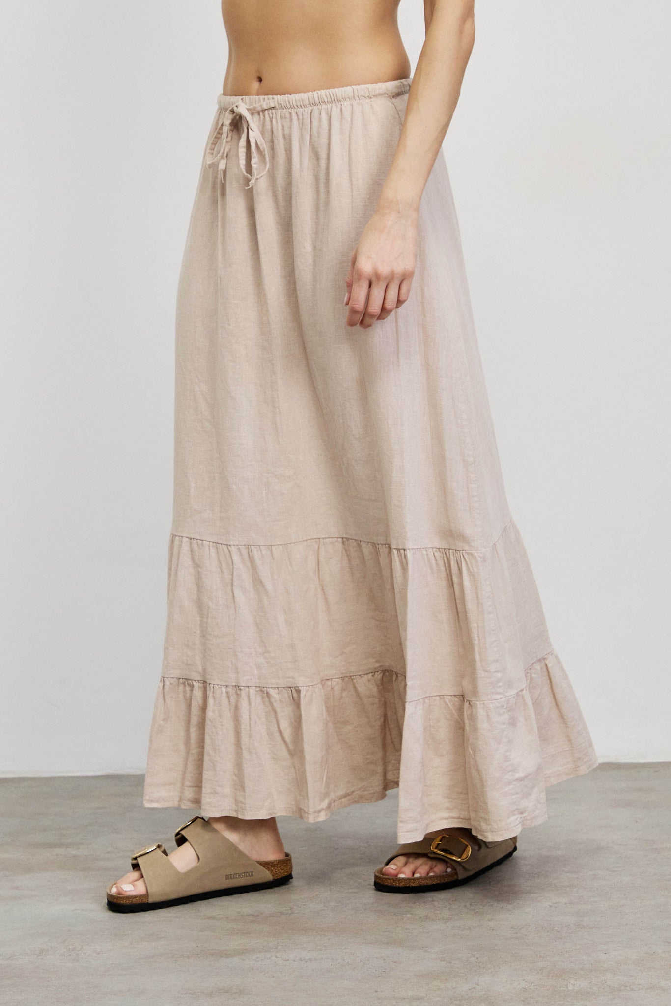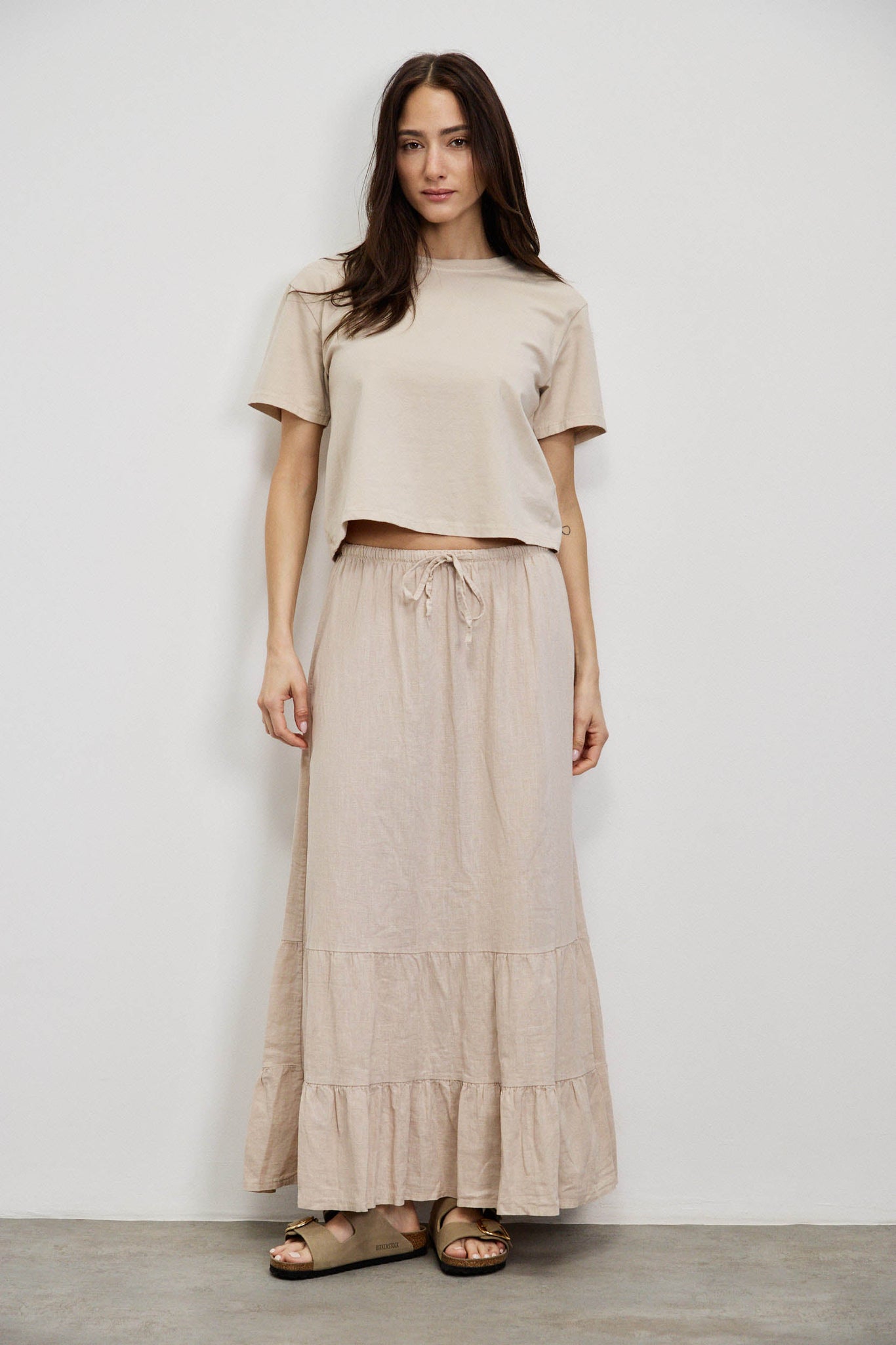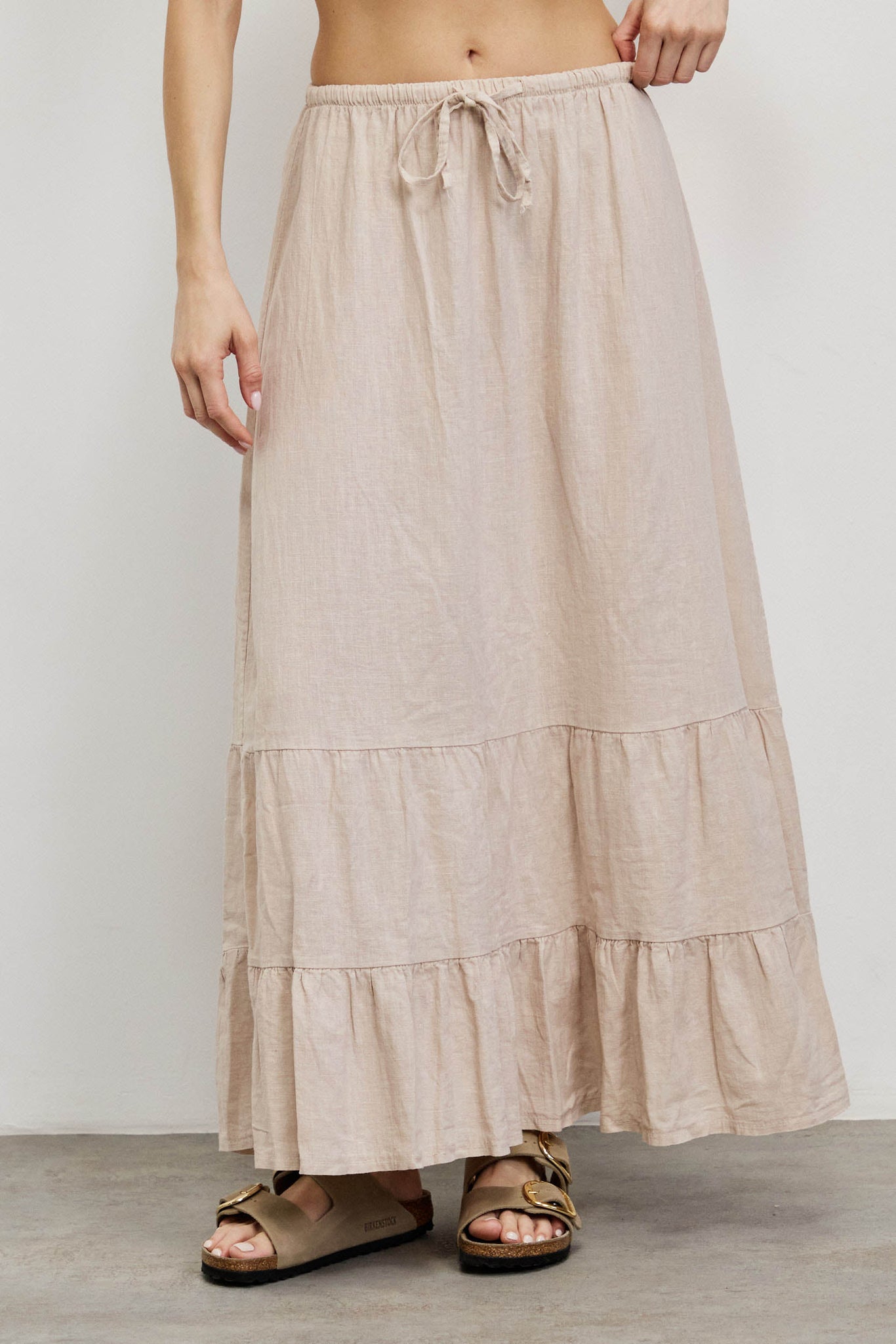 חצאית מקסי בעיצוב מדורג פריט קיץ מושלם המשלב אלגנטיות עם קלילות טבעית. עשויה משילוב איכותי של פשתן וכותנה איטלקית, המעניק לחצאית נפילה מושלמת ותחושה נעימה במיוחד על העור.