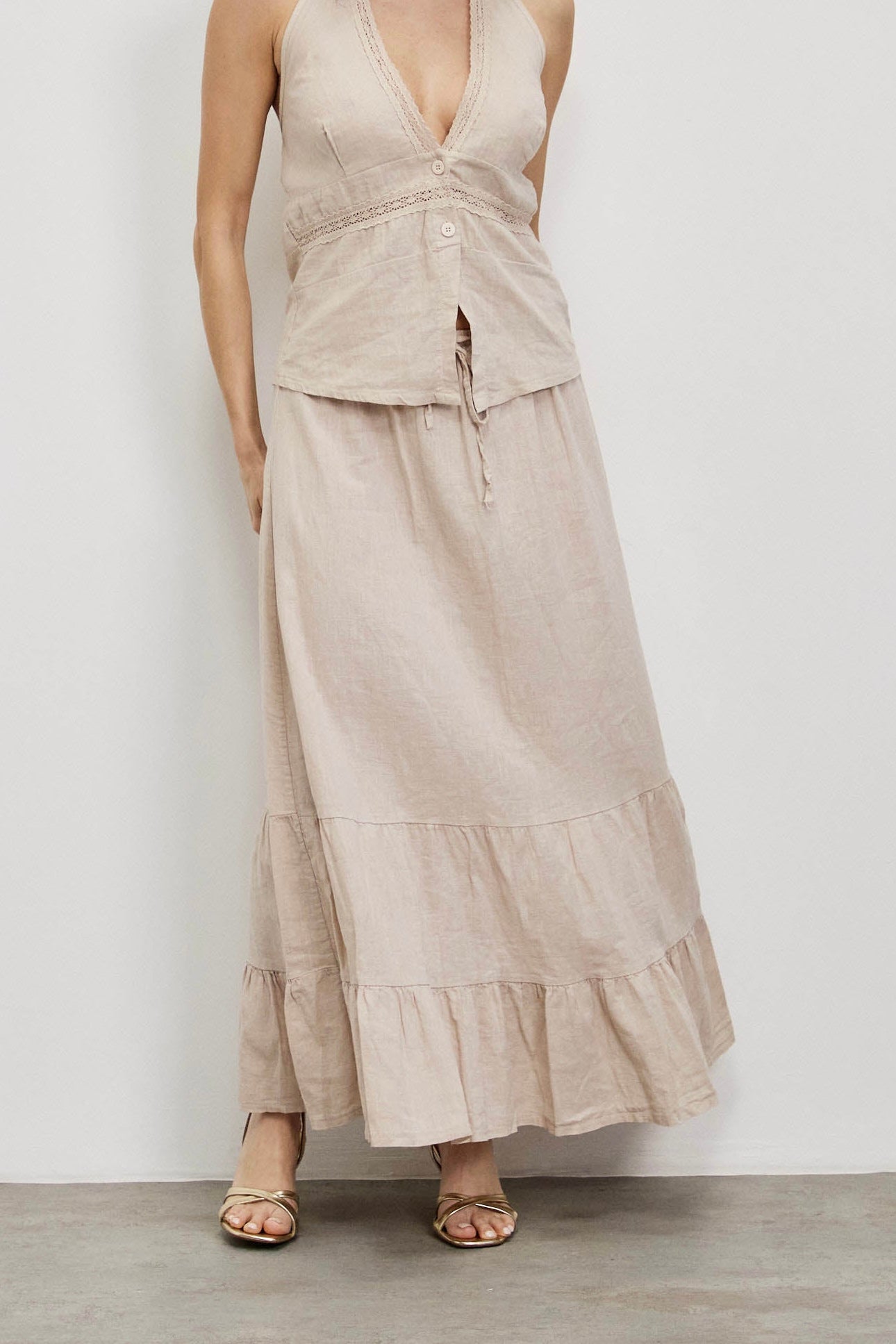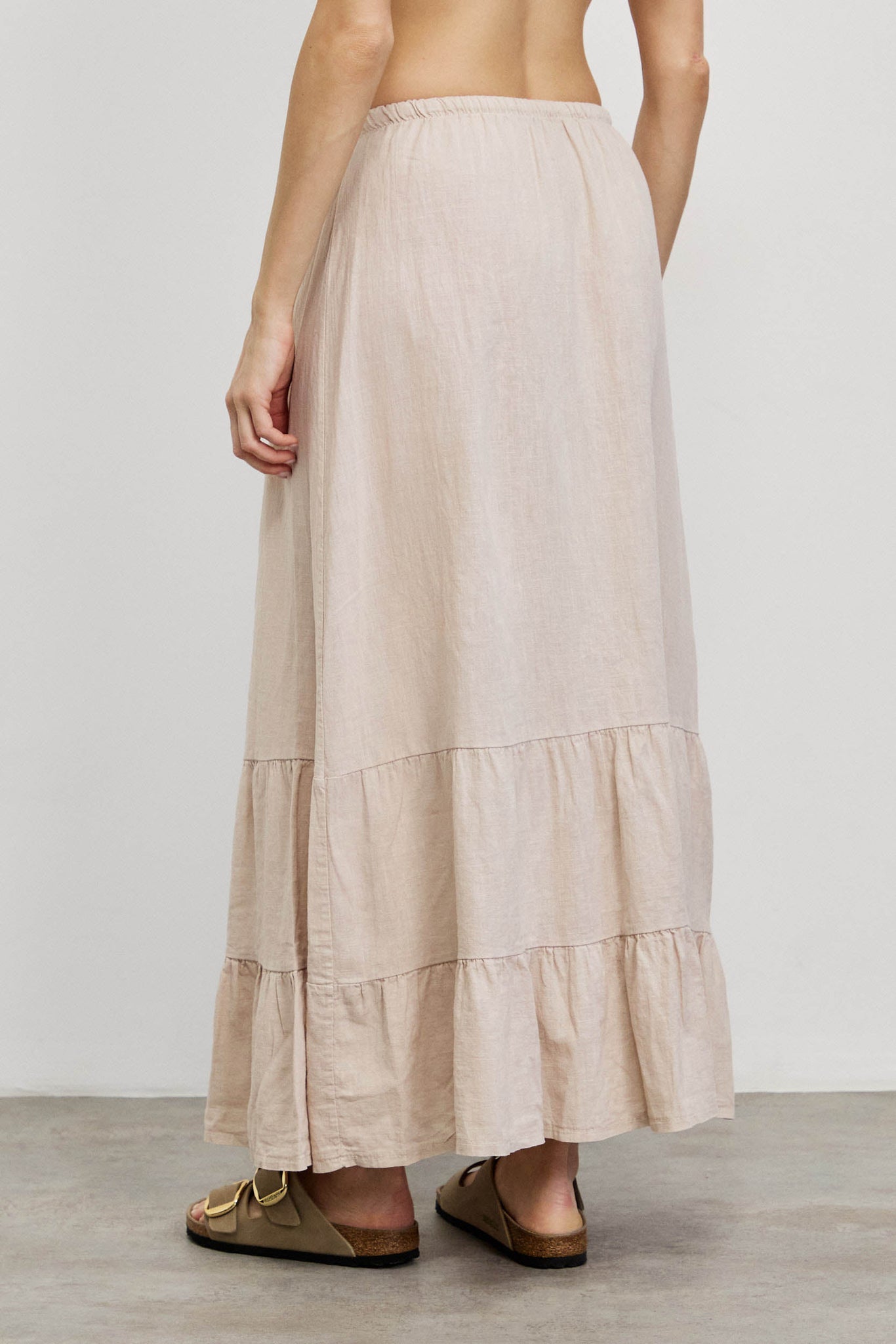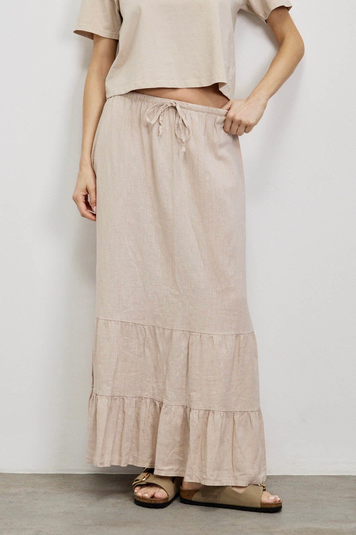 חצאית מקסי בעיצוב מדורג פריט קיץ מושלם המשלב אלגנטיות עם קלילות טבעית. עשויה משילוב איכותי של פשתן וכותנה איטלקית, המעניק לחצאית נפילה מושלמת ותחושה נעימה במיוחד על העור.