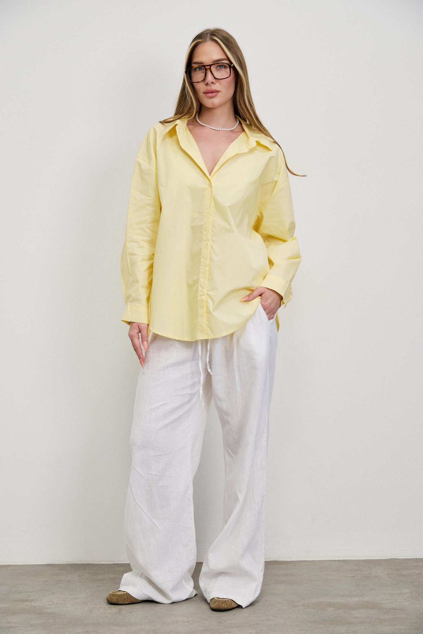 חולצת פשתן כותנה מכופתרת אוברסייז לבן