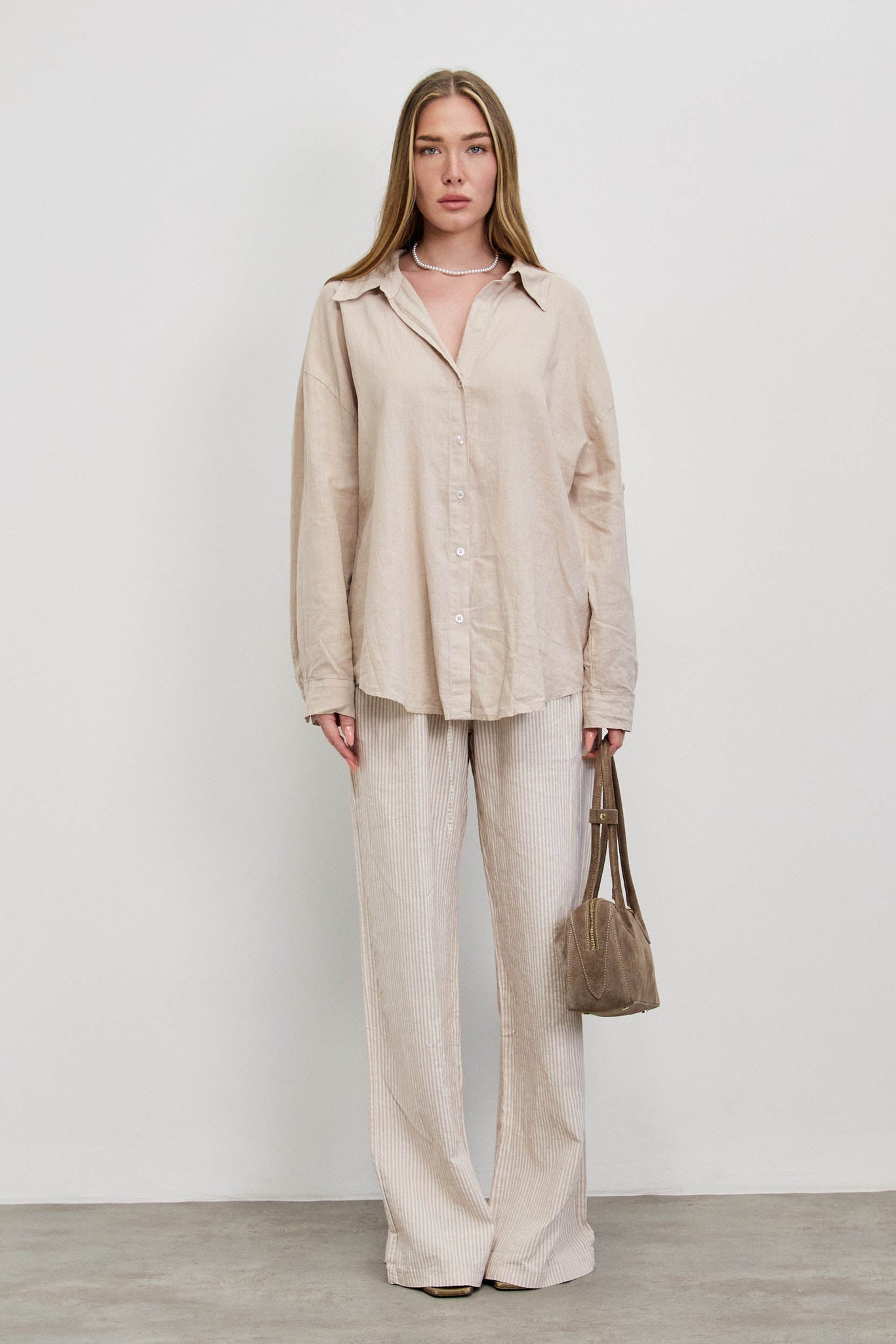חולצת פשתן כותנה מכופתרת אוברסייז בז