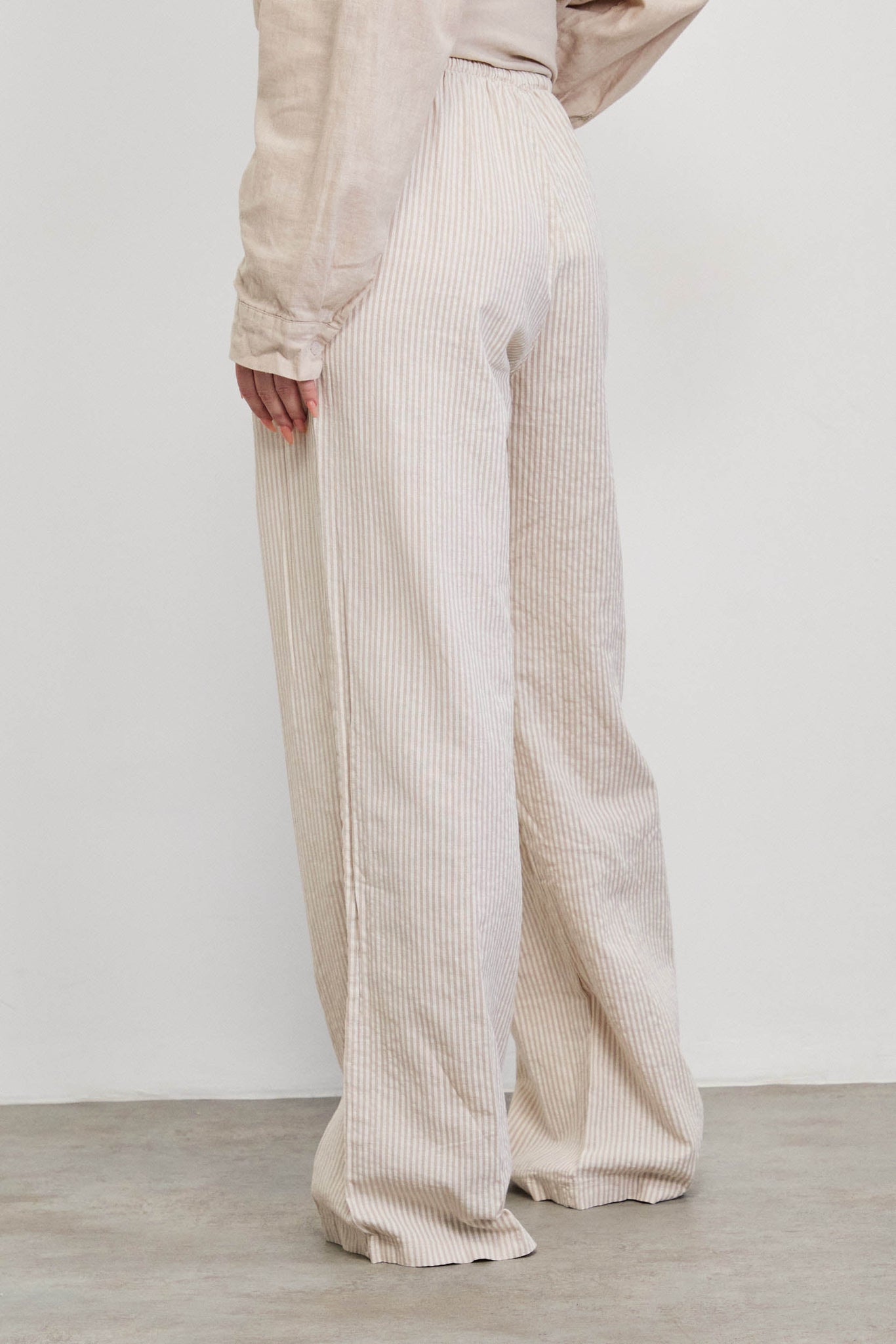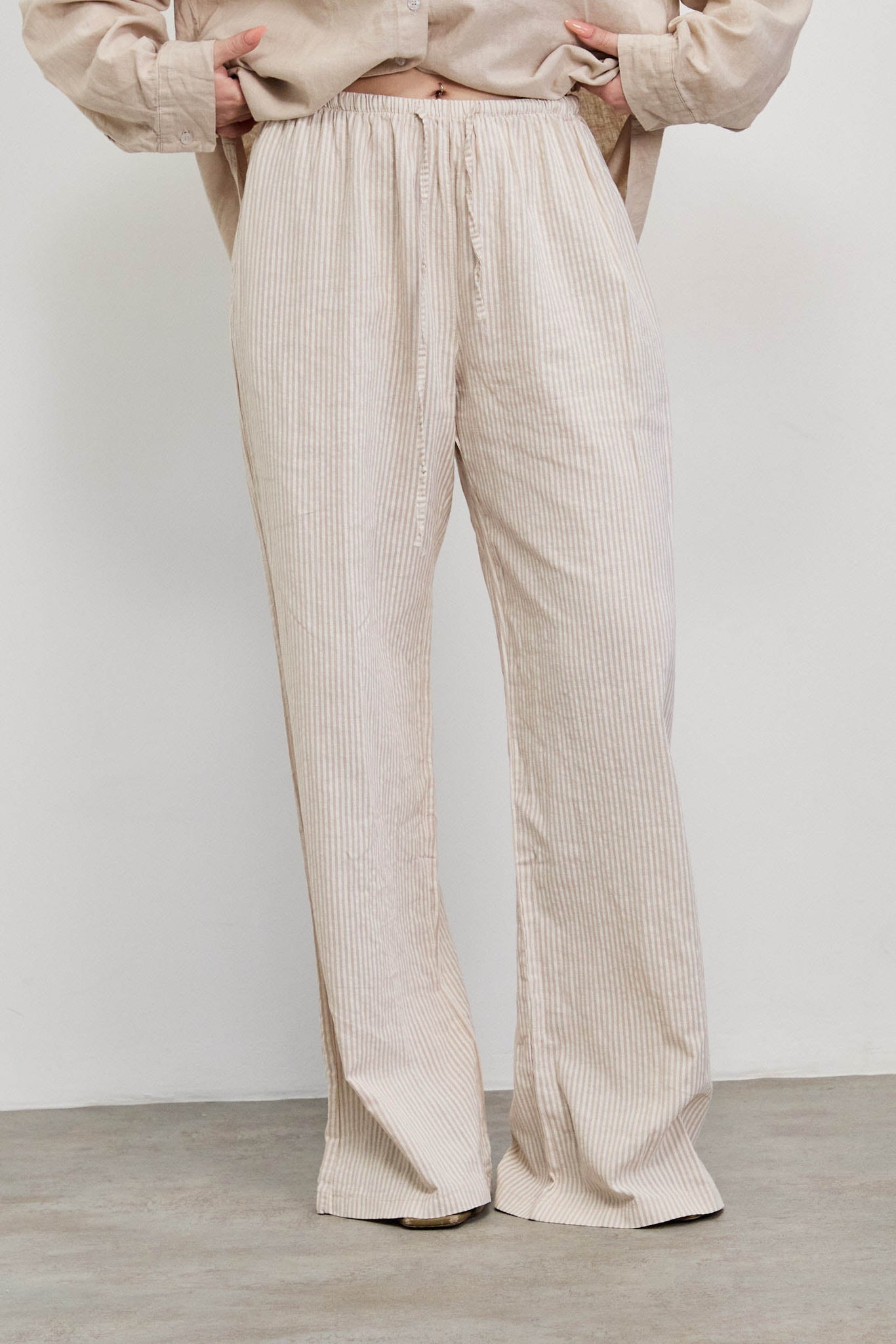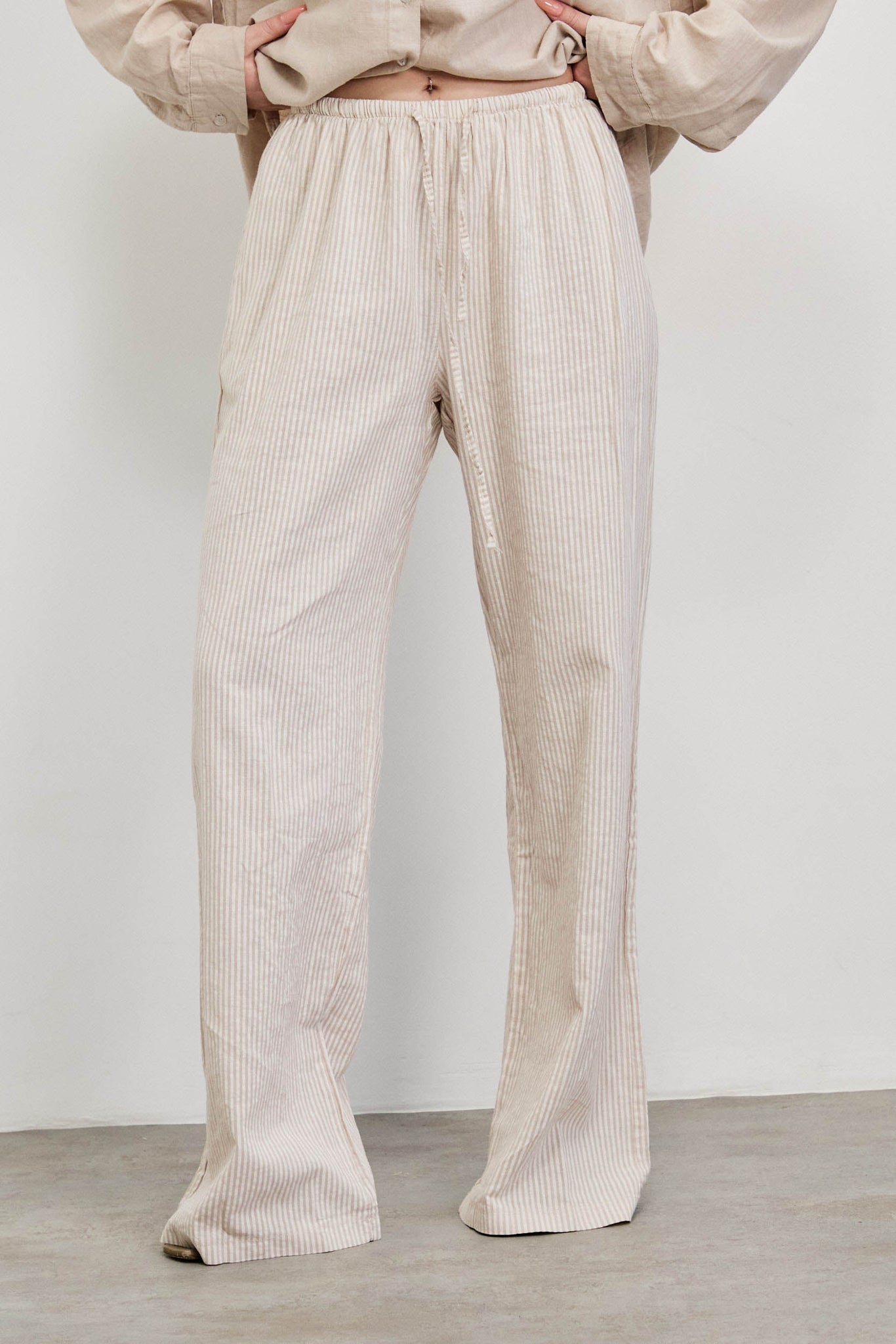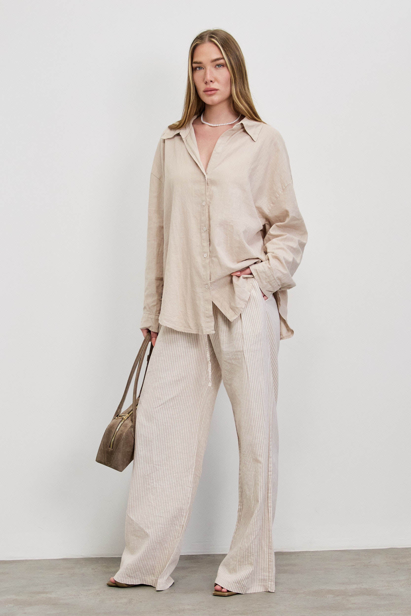מכנסי פשתן בגזרה משוחררת וישרה בדוגמת פסים פריט קיץ אולטימטיבי המשלב נוחות עם אלגנטיות. עשויים מתערובת איכותית של פשתן וכותנה איטלקית, המעניקה את האיזון המושלם בין מגע נעים, נשימות מעולה וקלילות אופיינית.