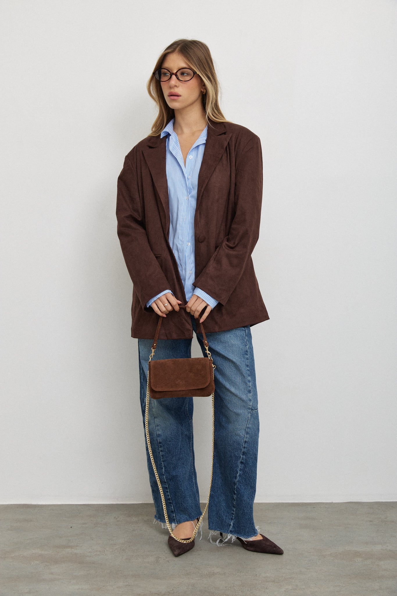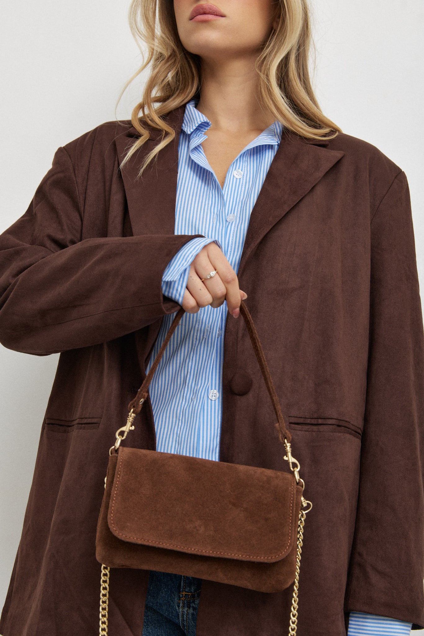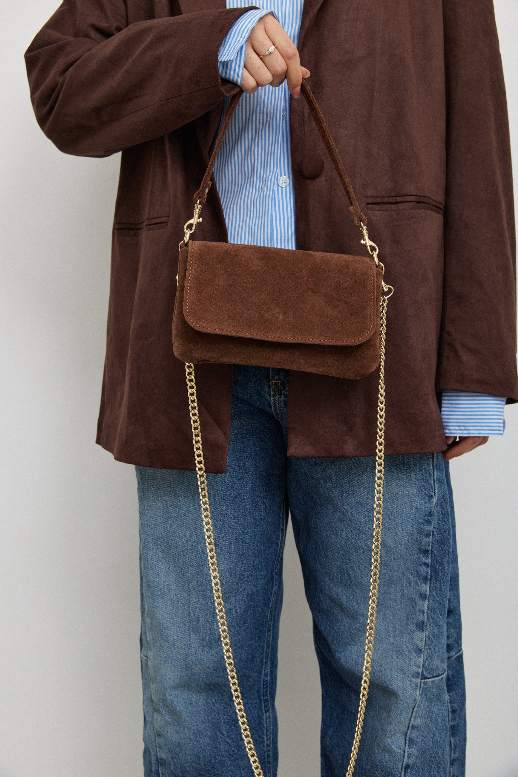 תיק קטן ומדויק, מעור זמש איטלקי רך ואיכותי, עם סגירת טיק-טק מתכת אלגנטית.