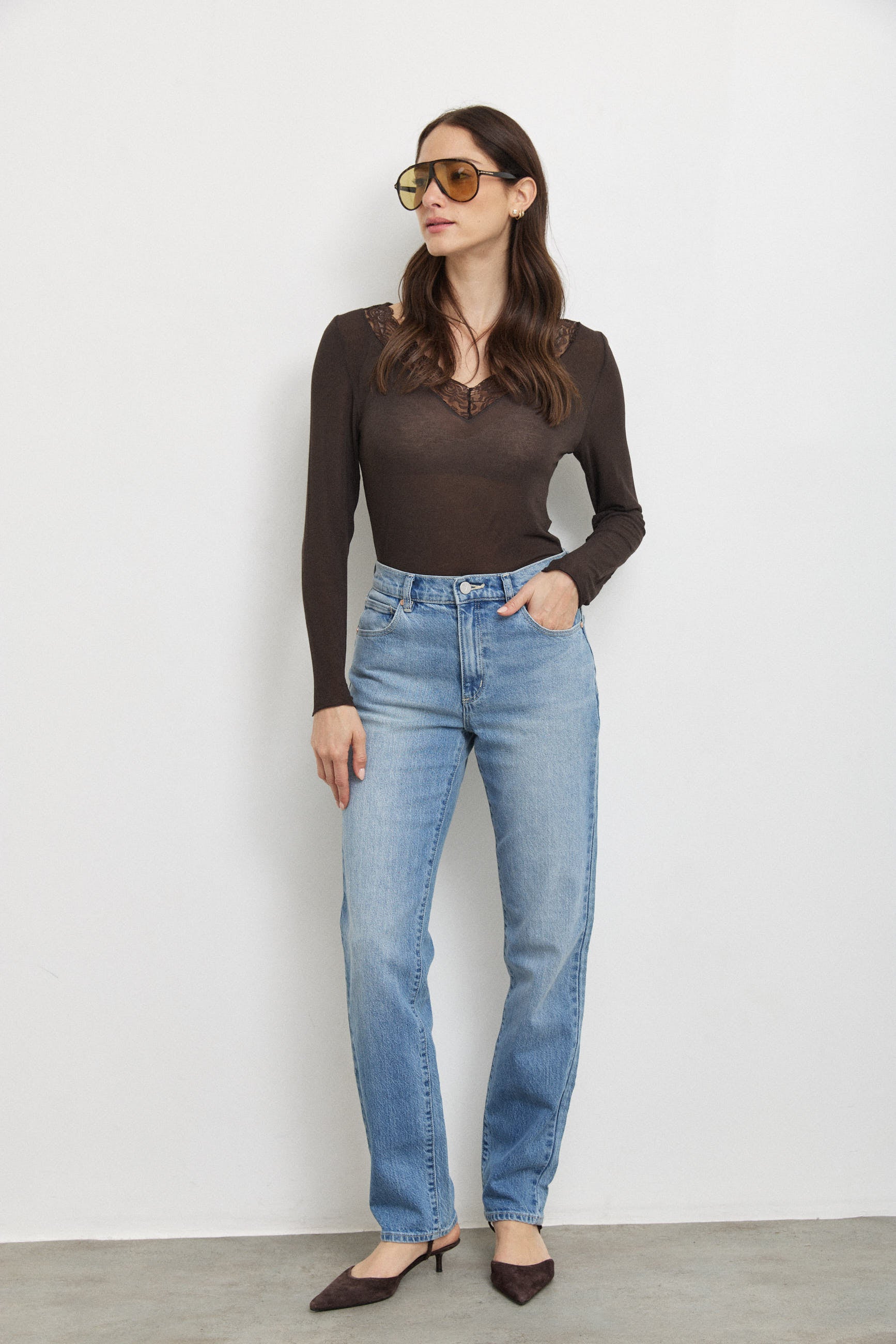 חולצת קשמיר תחרה וי חומה