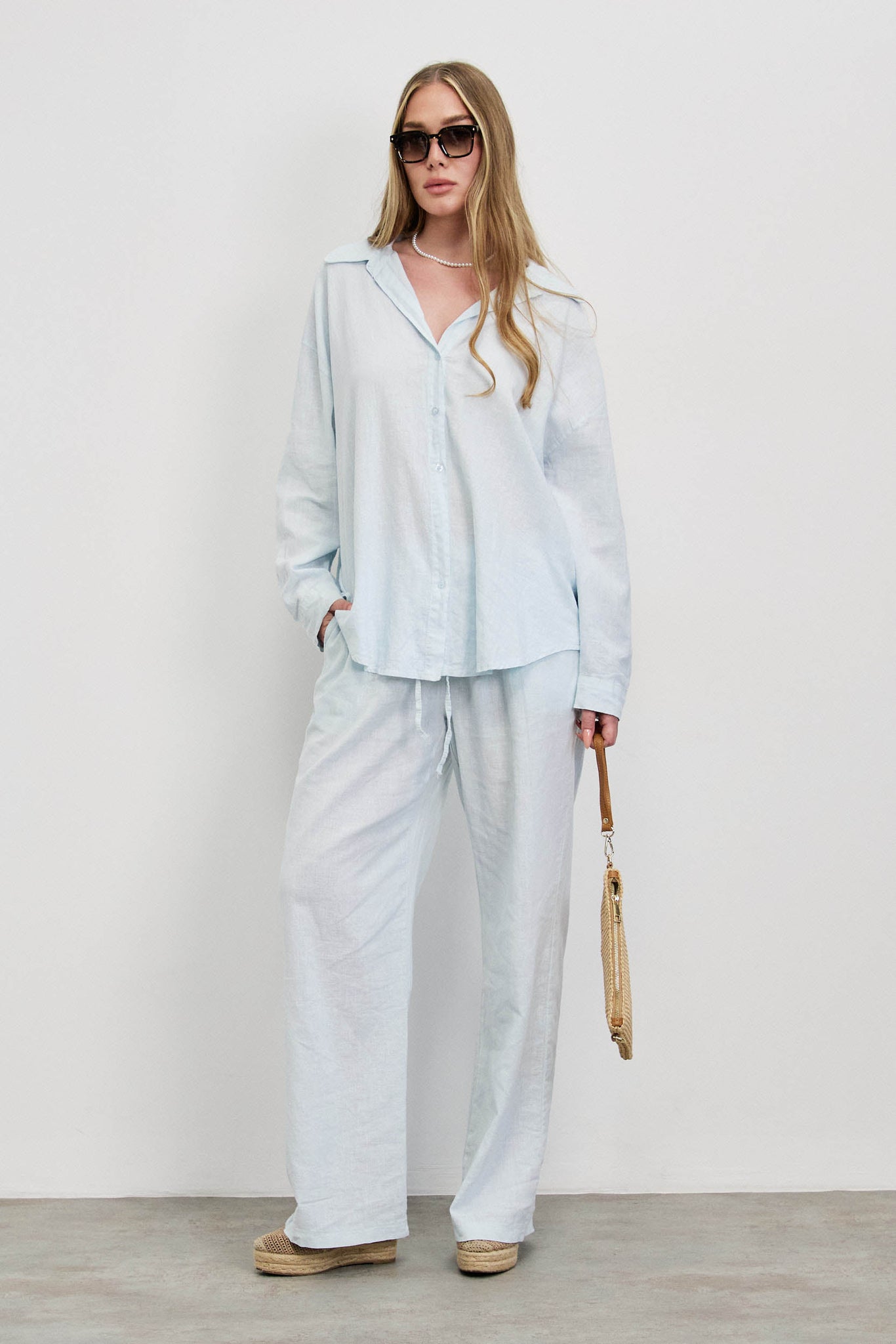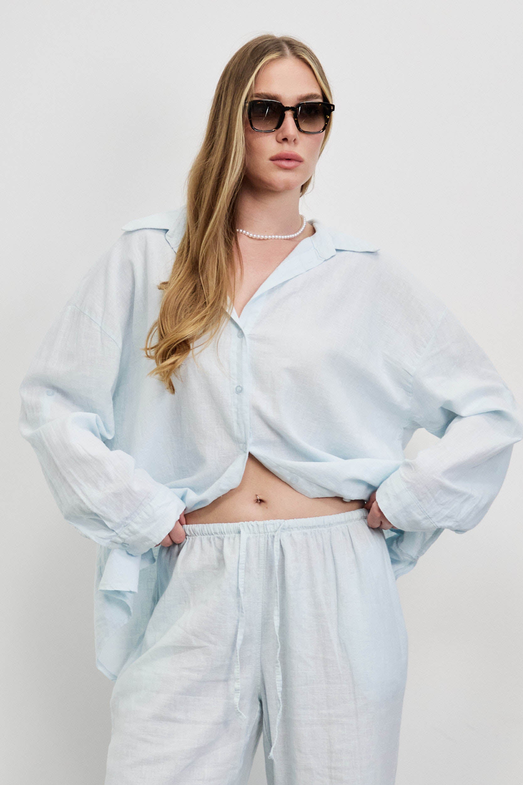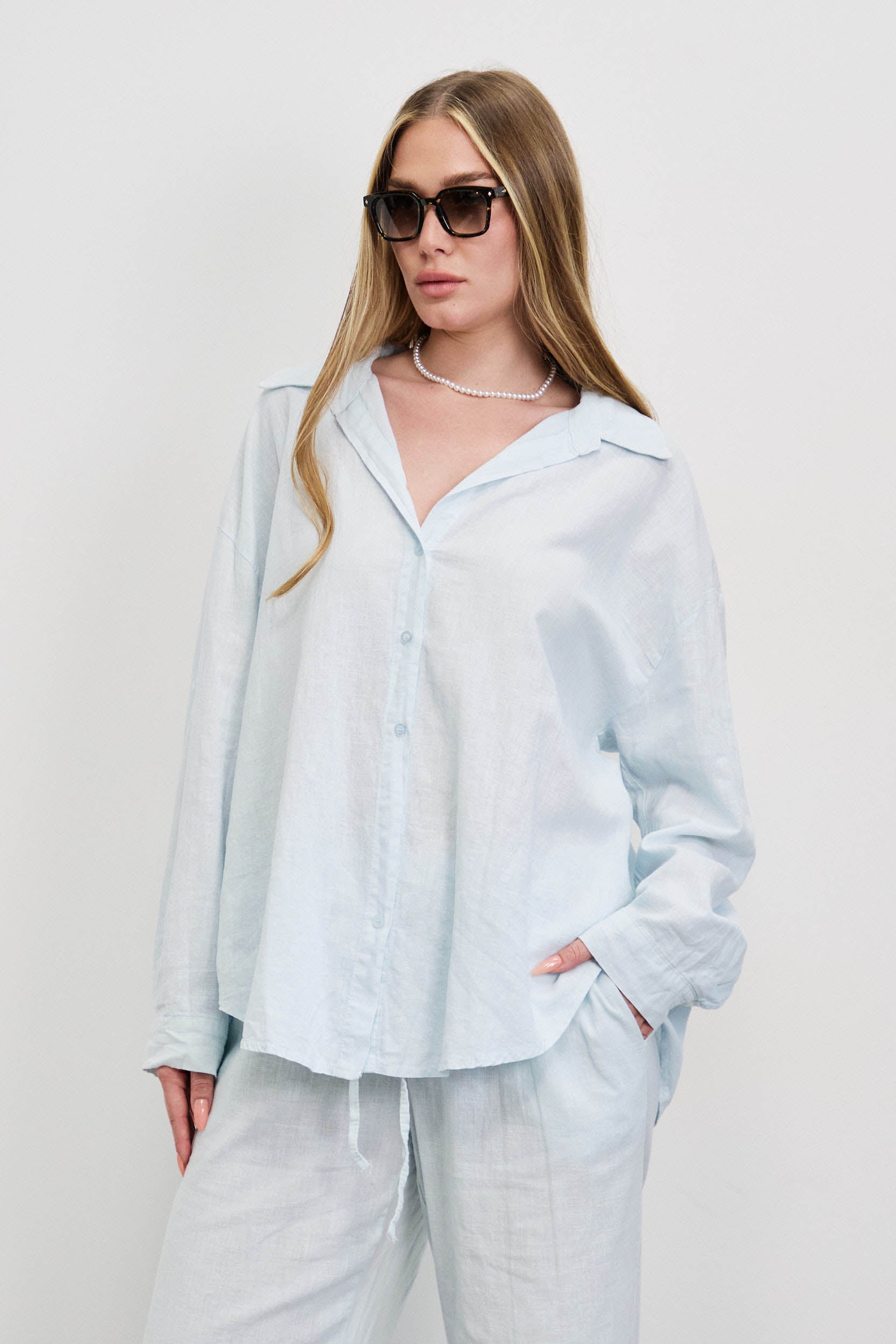 חולצת פשתן כותנה מכופתרת אוברסייז תכלת