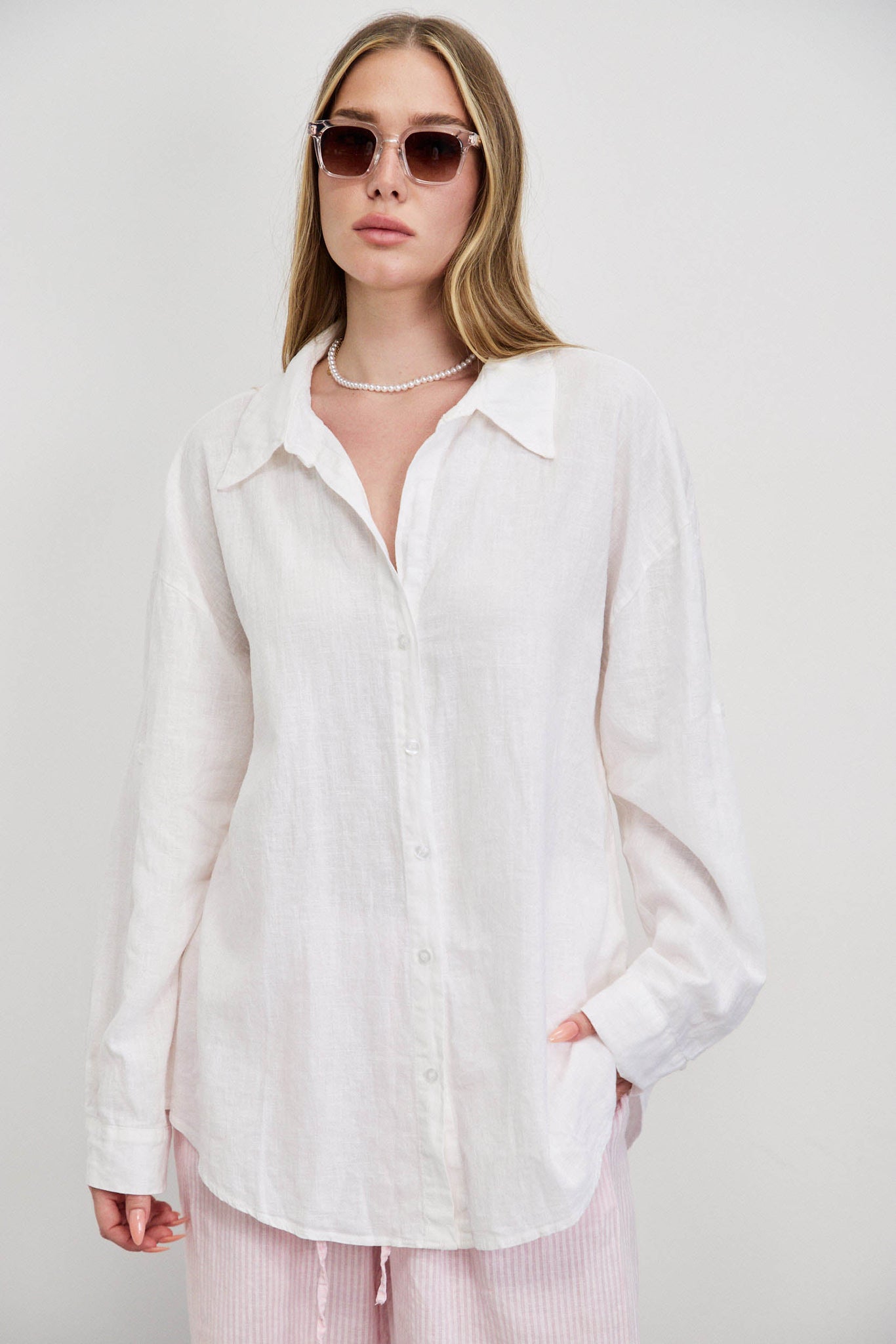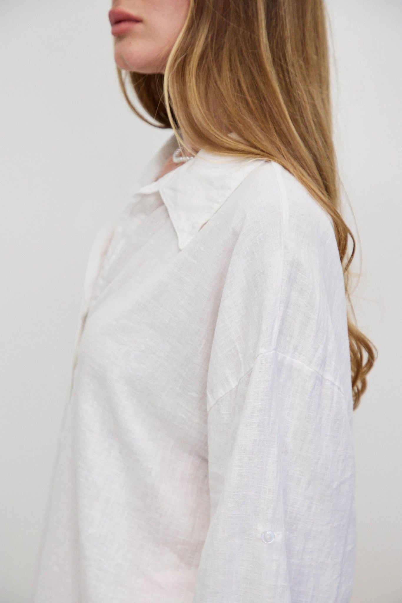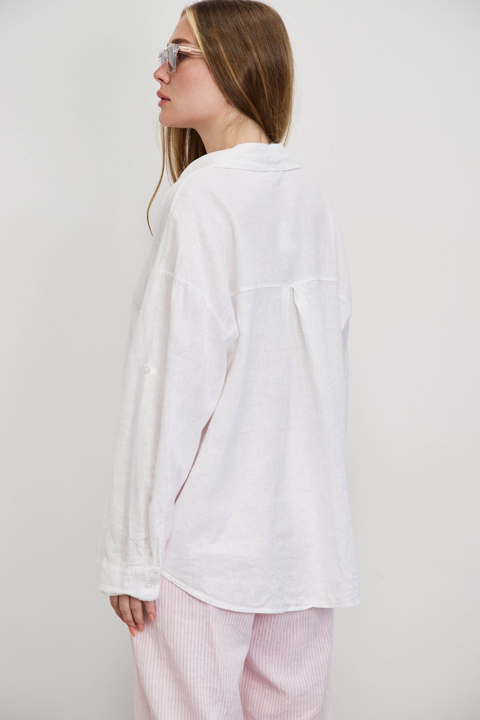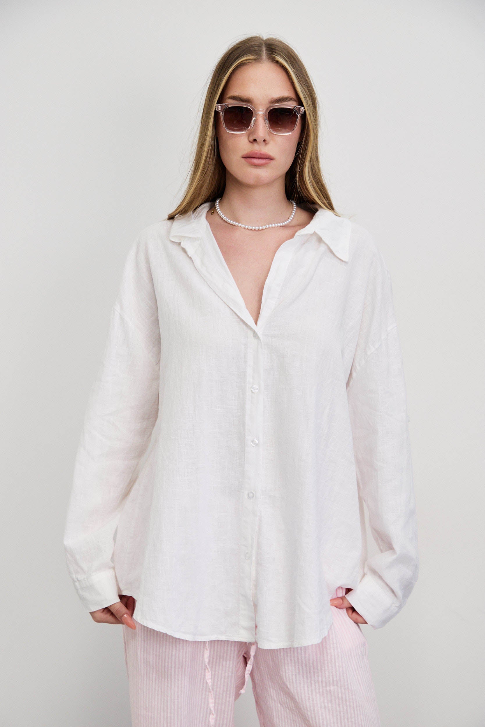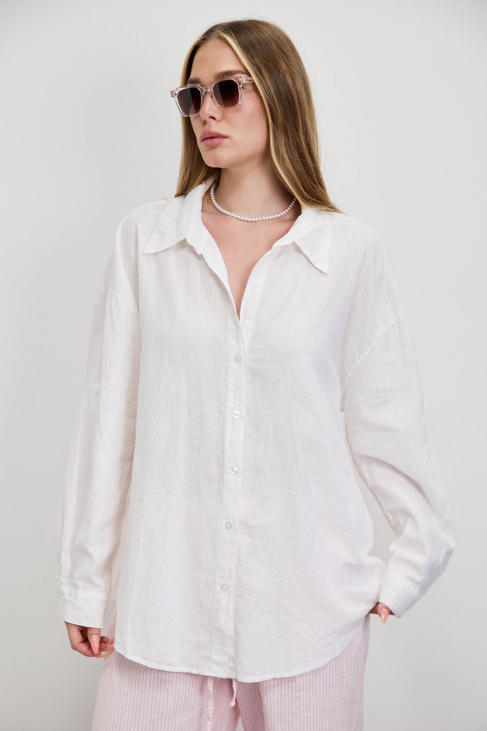 חולצת פשתן כותנה מכופתרת אוברסייז לבן