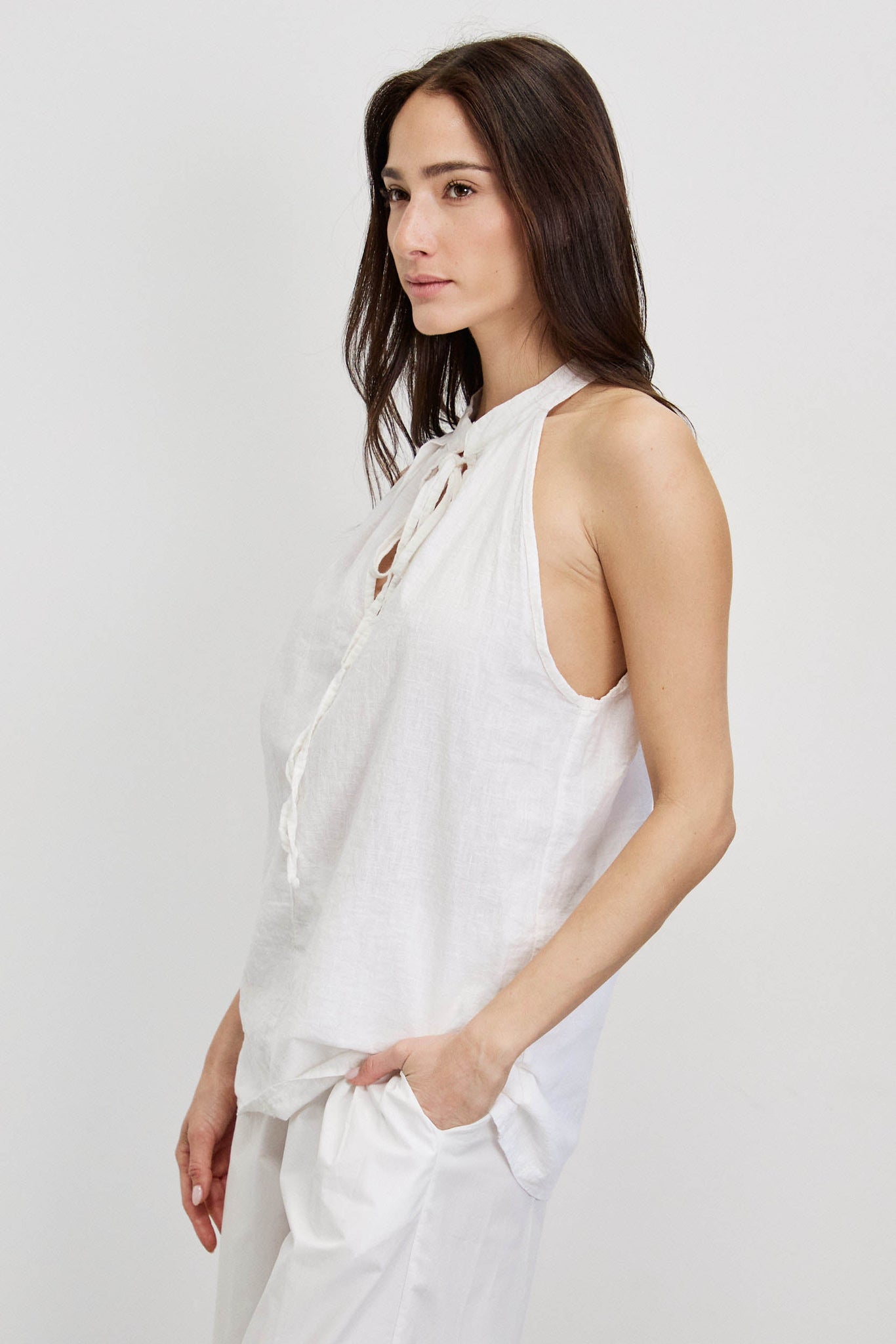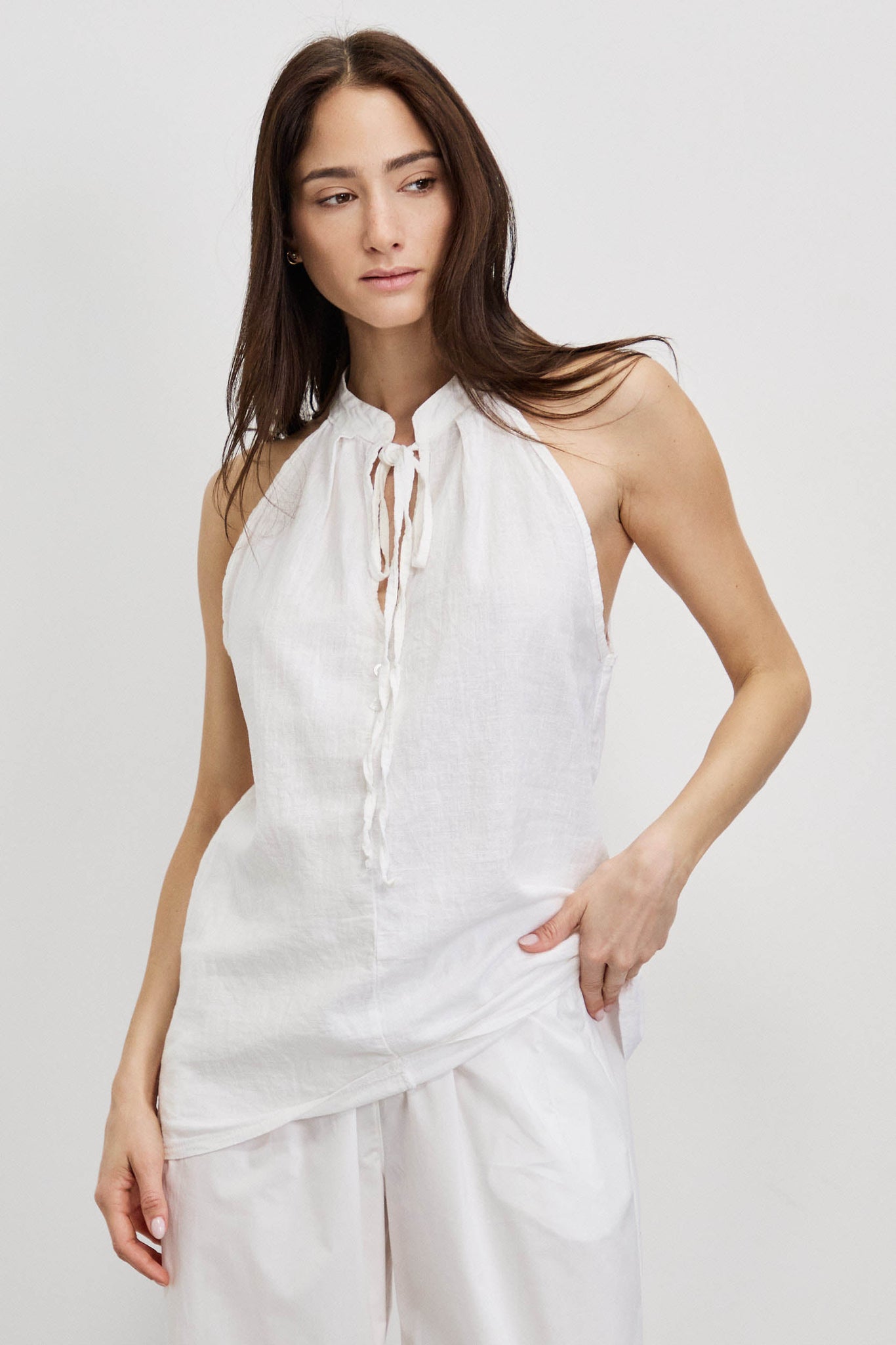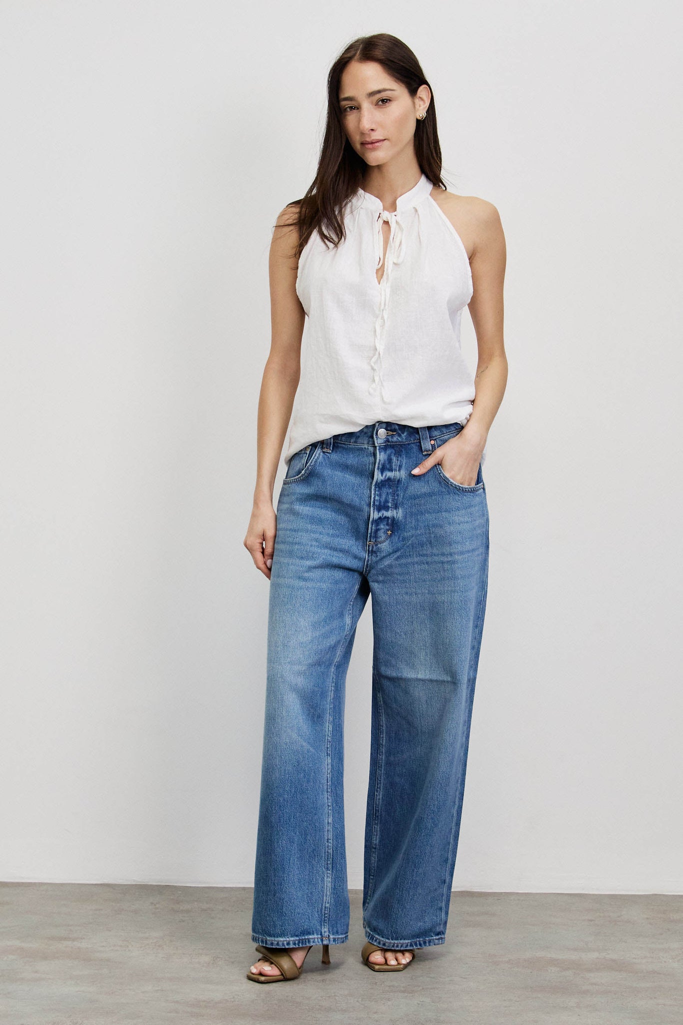 העיצוב כולל שלושה כפתורים קדמיים וקשירה עדינה באזור הצוואר, שמוסיפים טאץ' נשי ועדכני למראה. הגזרה המשוחררת יוצרת לוק קיצי ונינוח שמתאים ללבישה יומיומית.