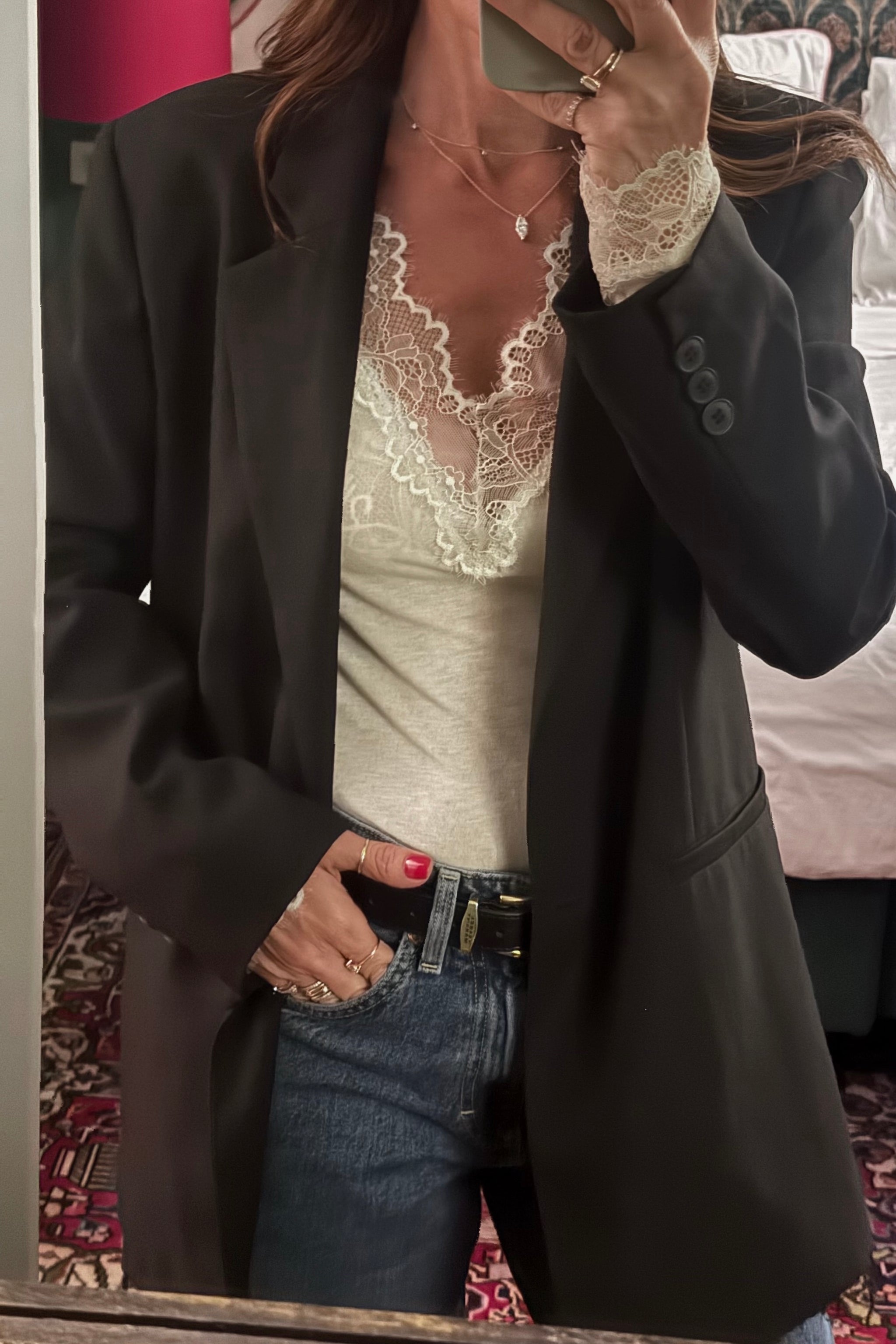 מהמותג האיטלקי האהוב Lomina - חולצה רכה ונעימה עם מגע יוקרתי של קשמיר (5%) וגימור תחרה עדין בצווארון ובשרוולים.