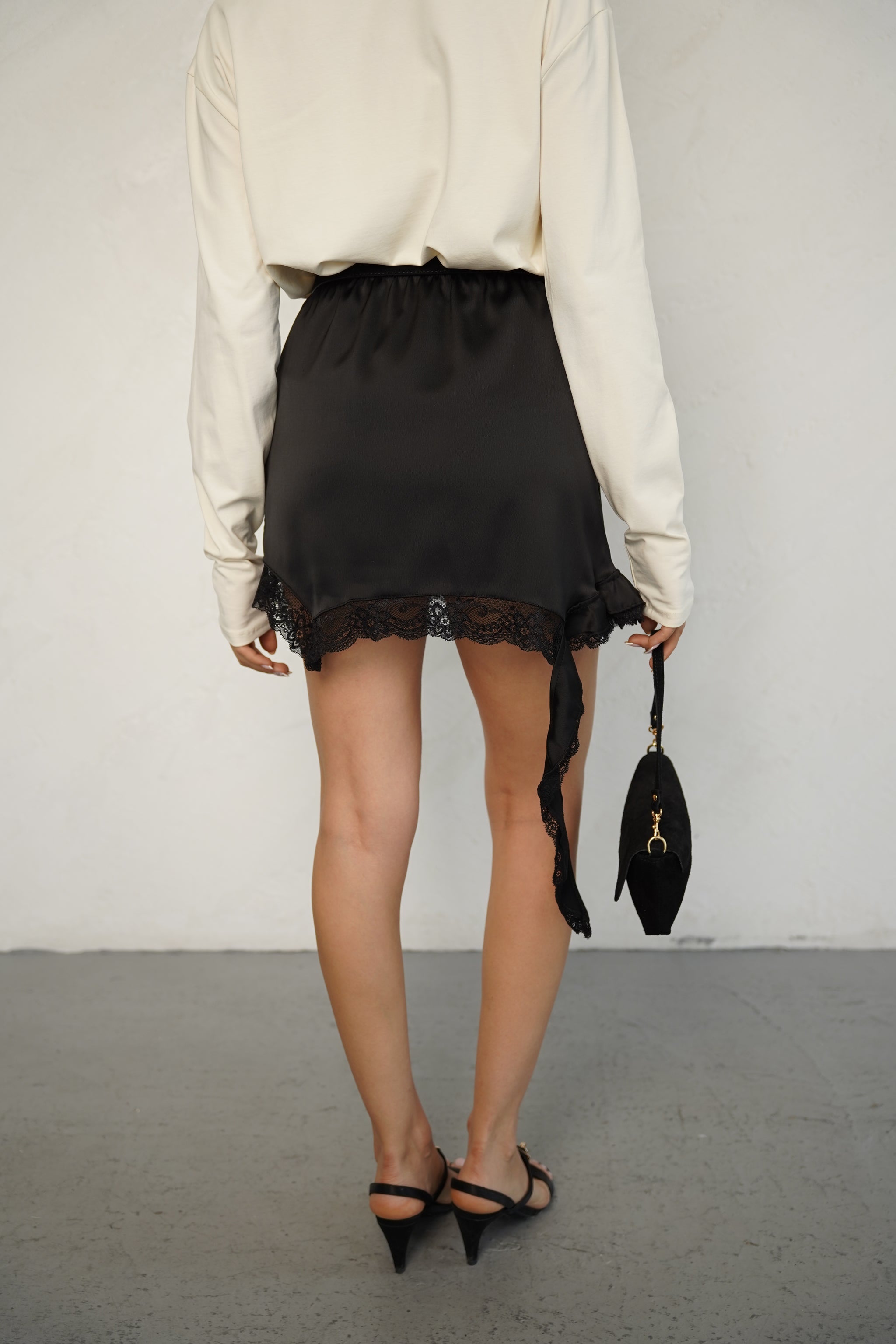 חצאית מיני עדינה ומדויקת בגזרת סאטן חלקה, עם נגיעת תחרה רכה בתחתית שמוסיפה לה שיק נשי ואלגנטי.