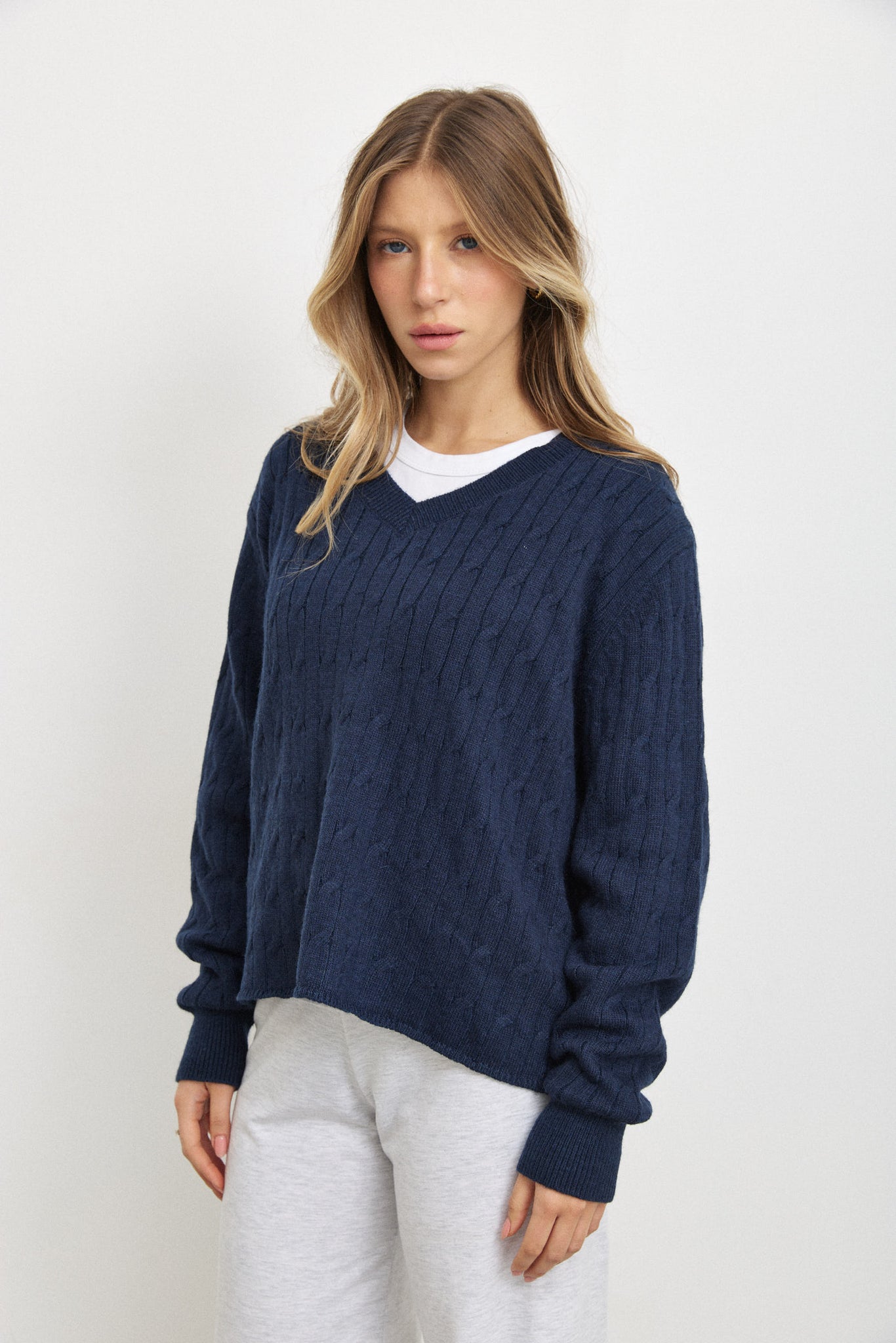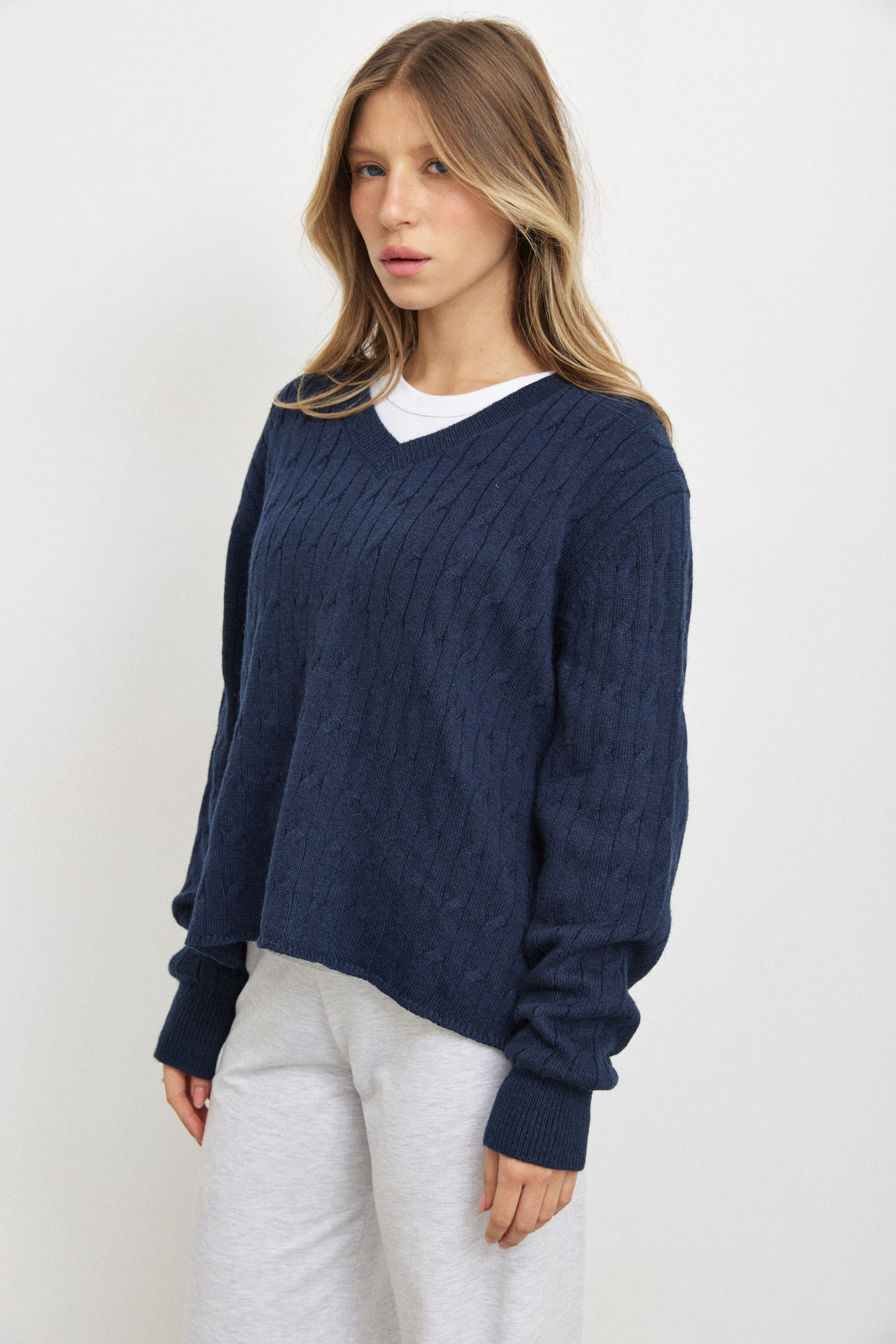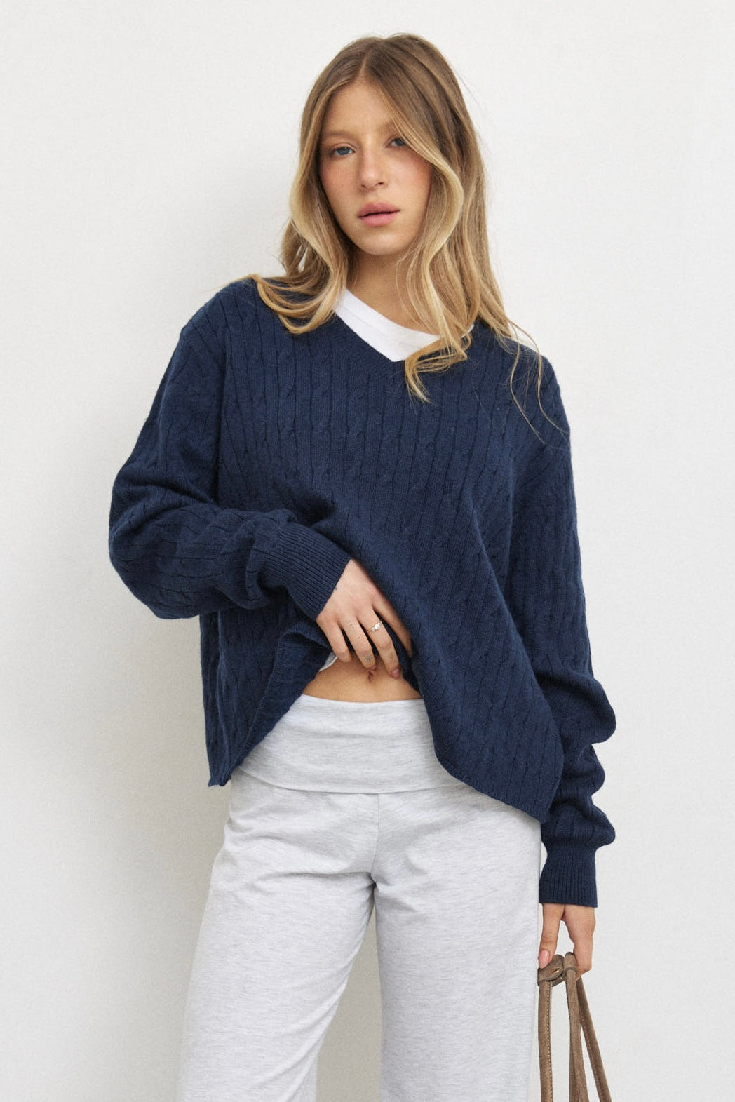 סריג איכותי עם טקסטורת צמות עדינה ומפתח V מחמיא, בגזרה מעט אוברסייז שיושבת רך ונעים על הגוף.