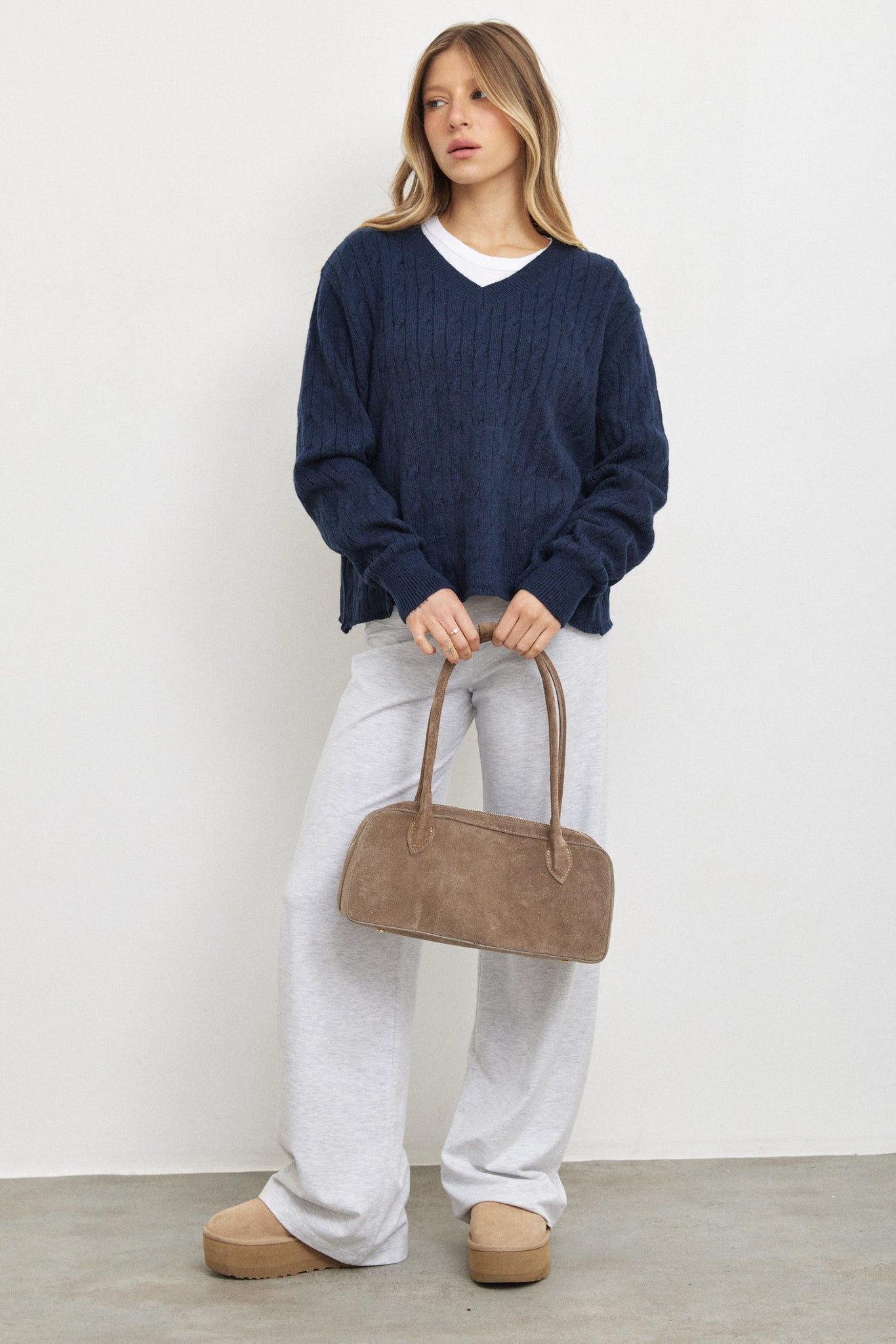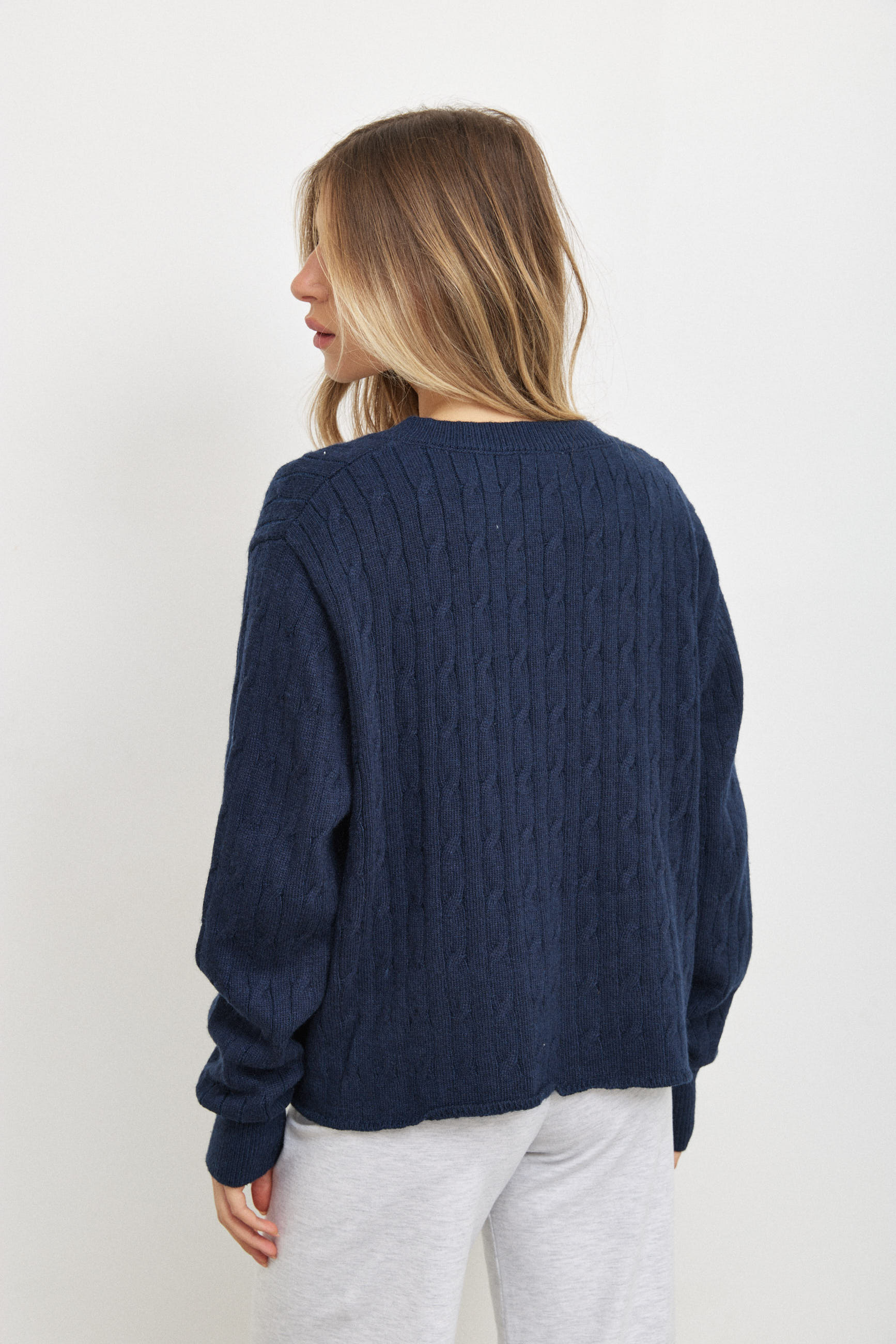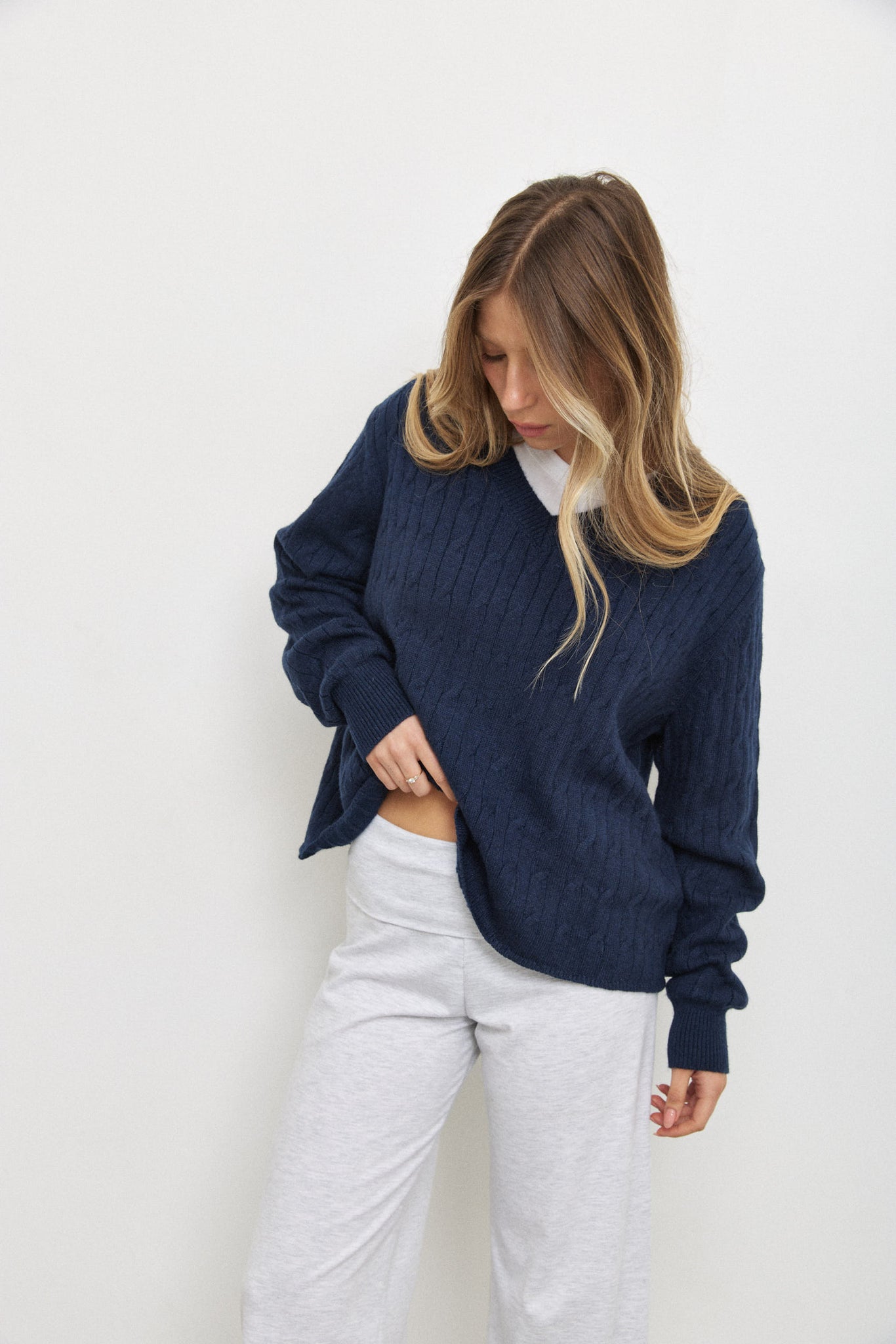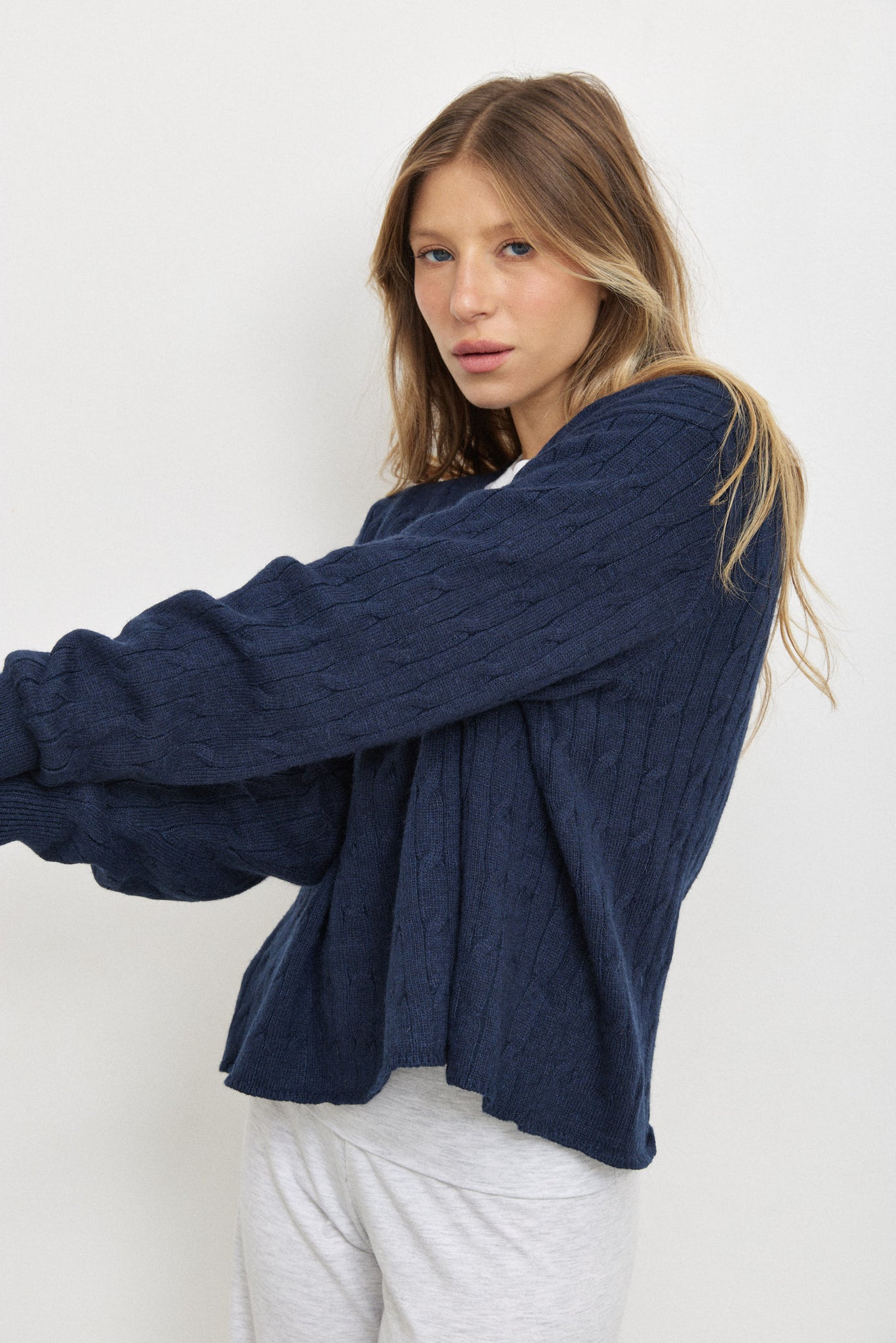 סריג איכותי עם טקסטורת צמות עדינה ומפתח V מחמיא, בגזרה מעט אוברסייז שיושבת רך ונעים על הגוף.
