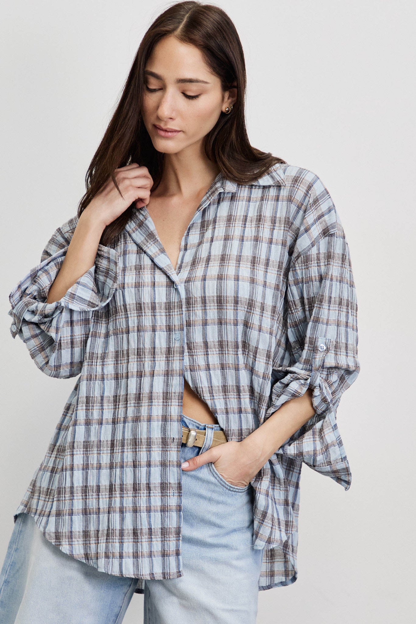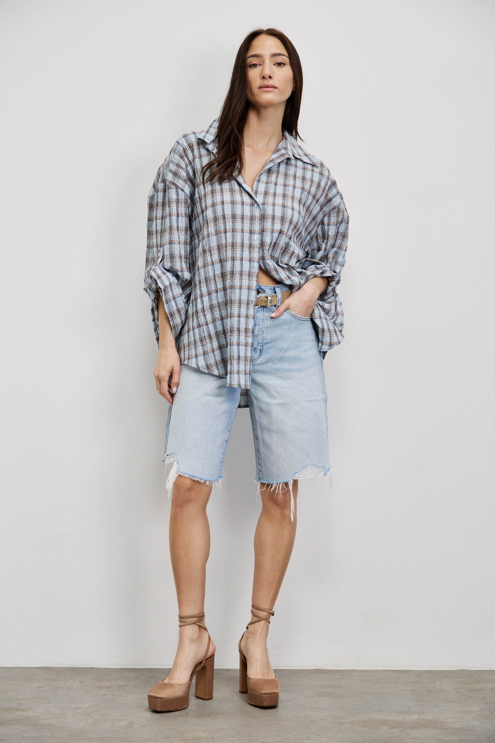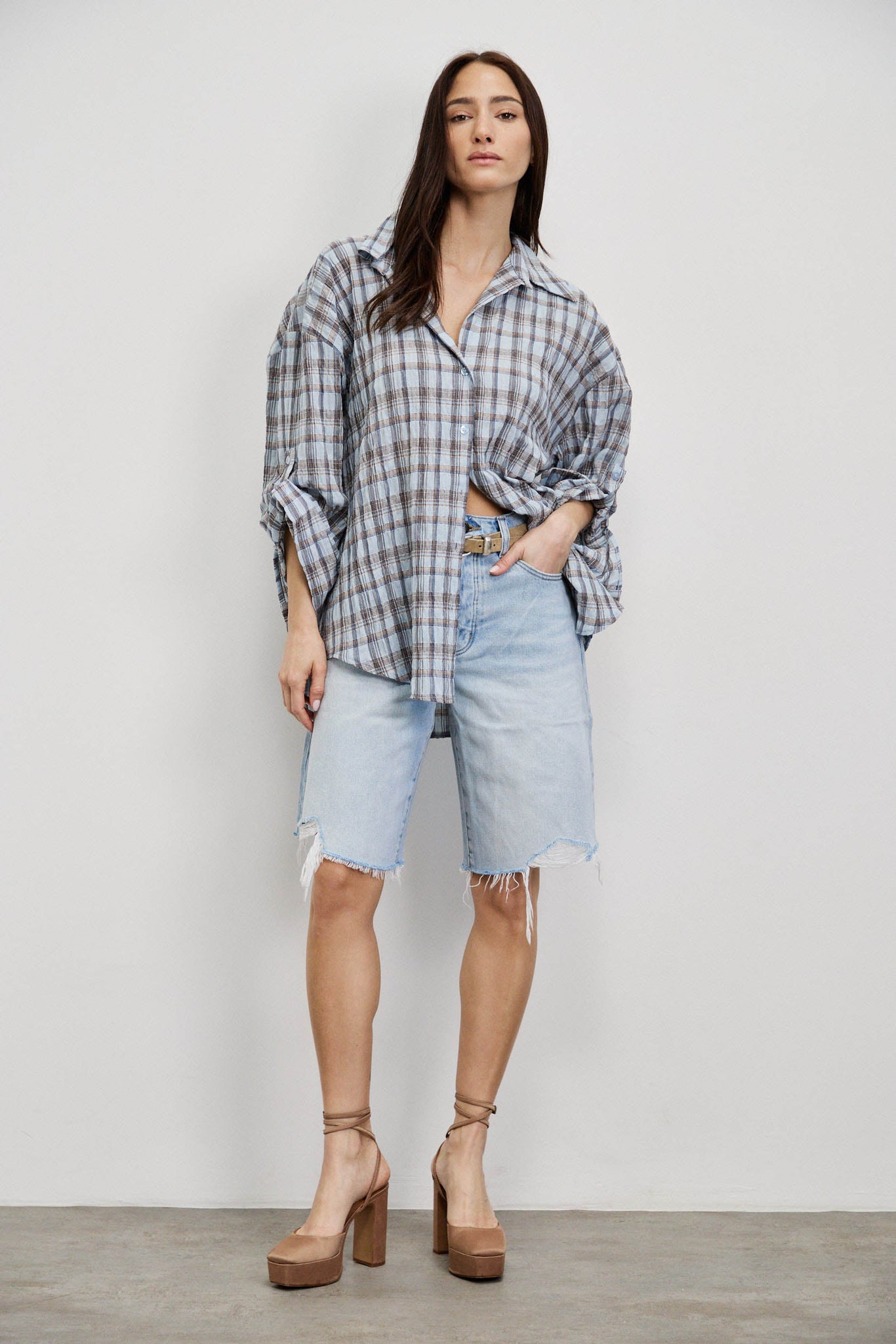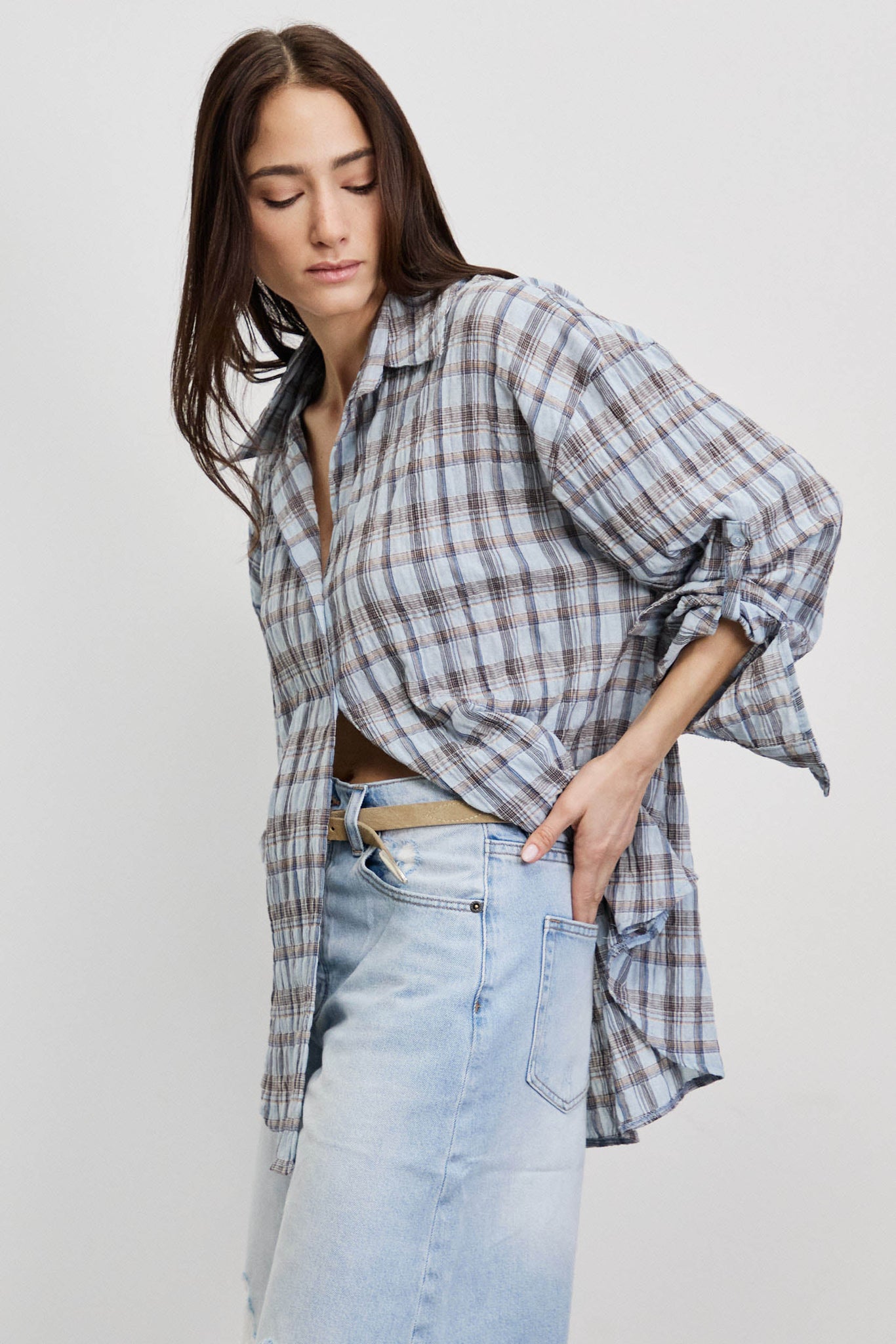 הבד בעל טקסטורה מעט מקומטת בעדינות, שמוסיפה אופי מיוחד למראה ויוצרת לוק קליל, טבעי ועל זמני. זהו חלק מהעיצוב של הבד ומעניק לחולצה את הייחודיות שלה.
