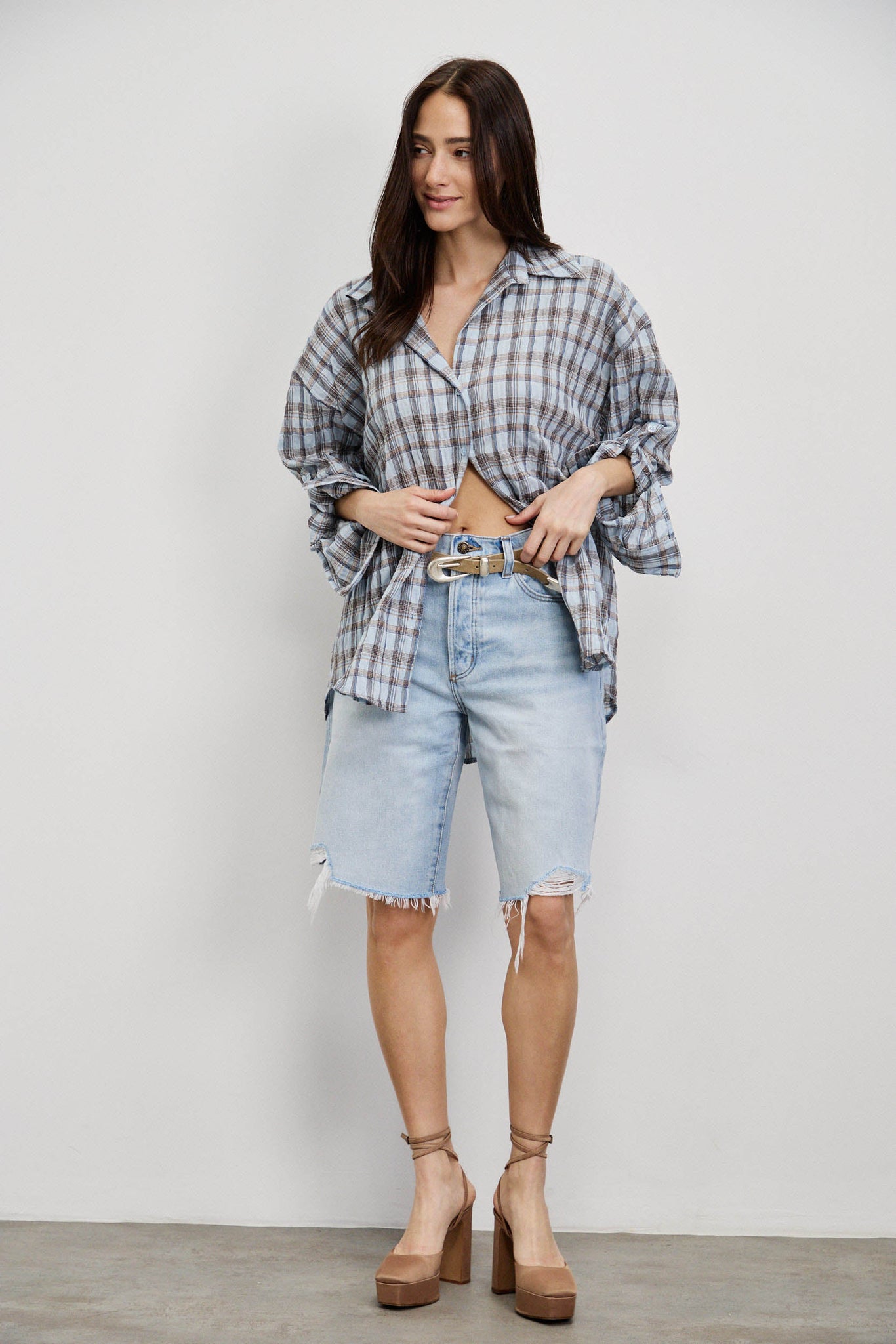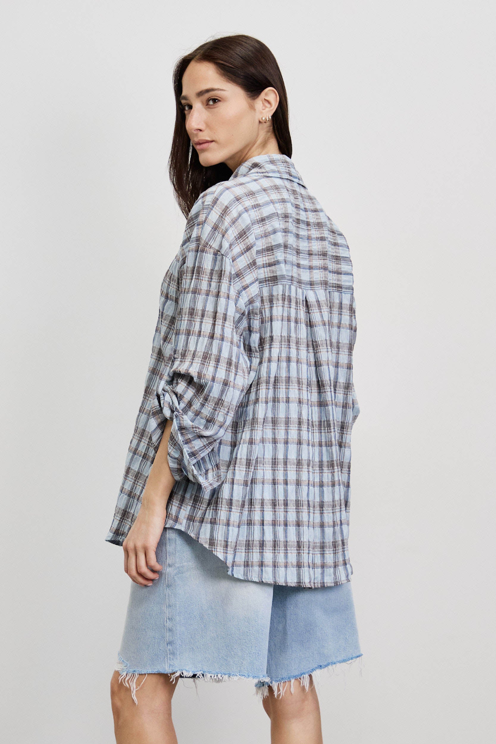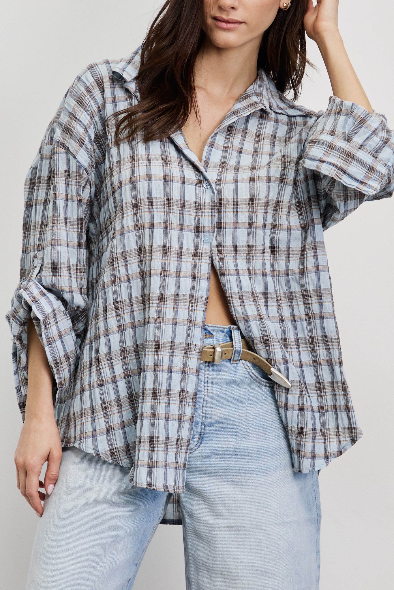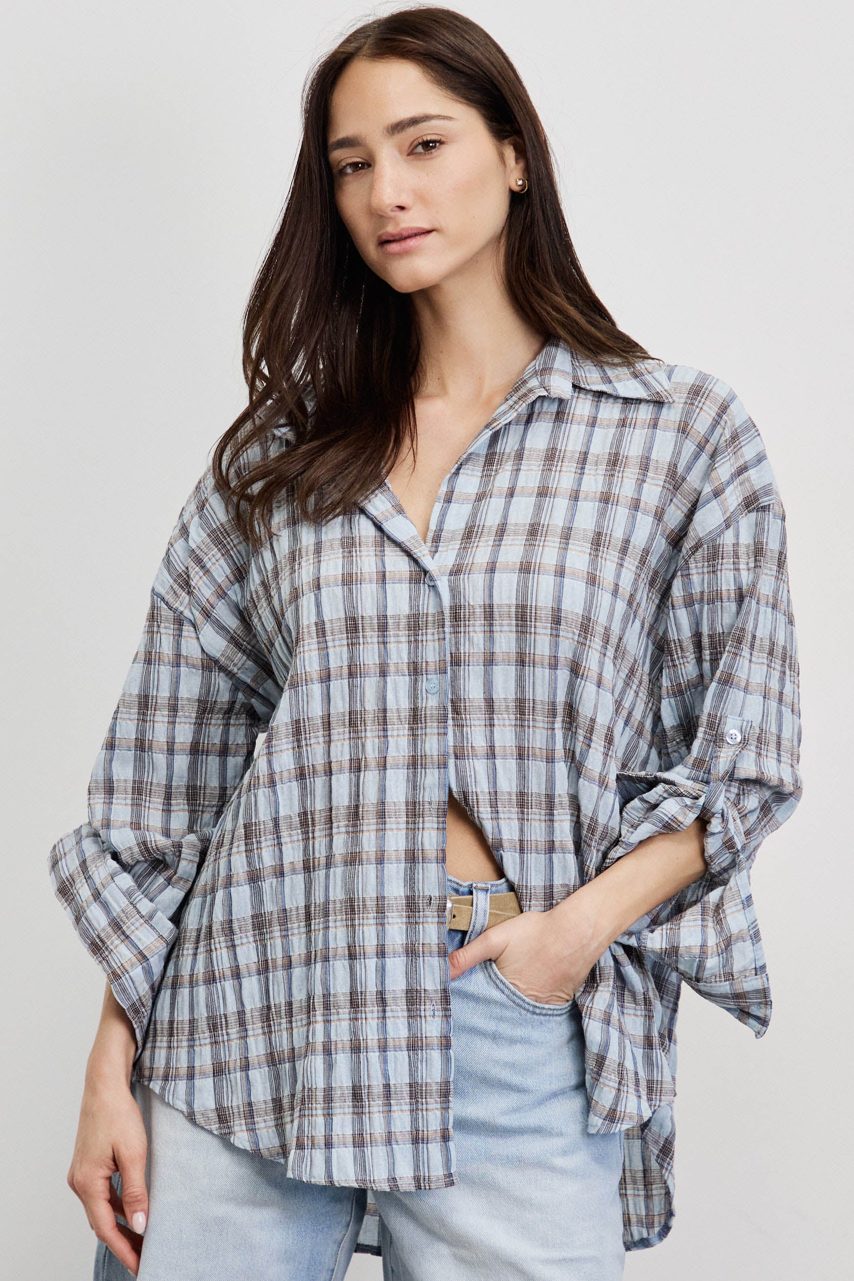 הבד בעל טקסטורה מעט מקומטת בעדינות, שמוסיפה אופי מיוחד למראה ויוצרת לוק קליל, טבעי ועל זמני. זהו חלק מהעיצוב של הבד ומעניק לחולצה את הייחודיות שלה.