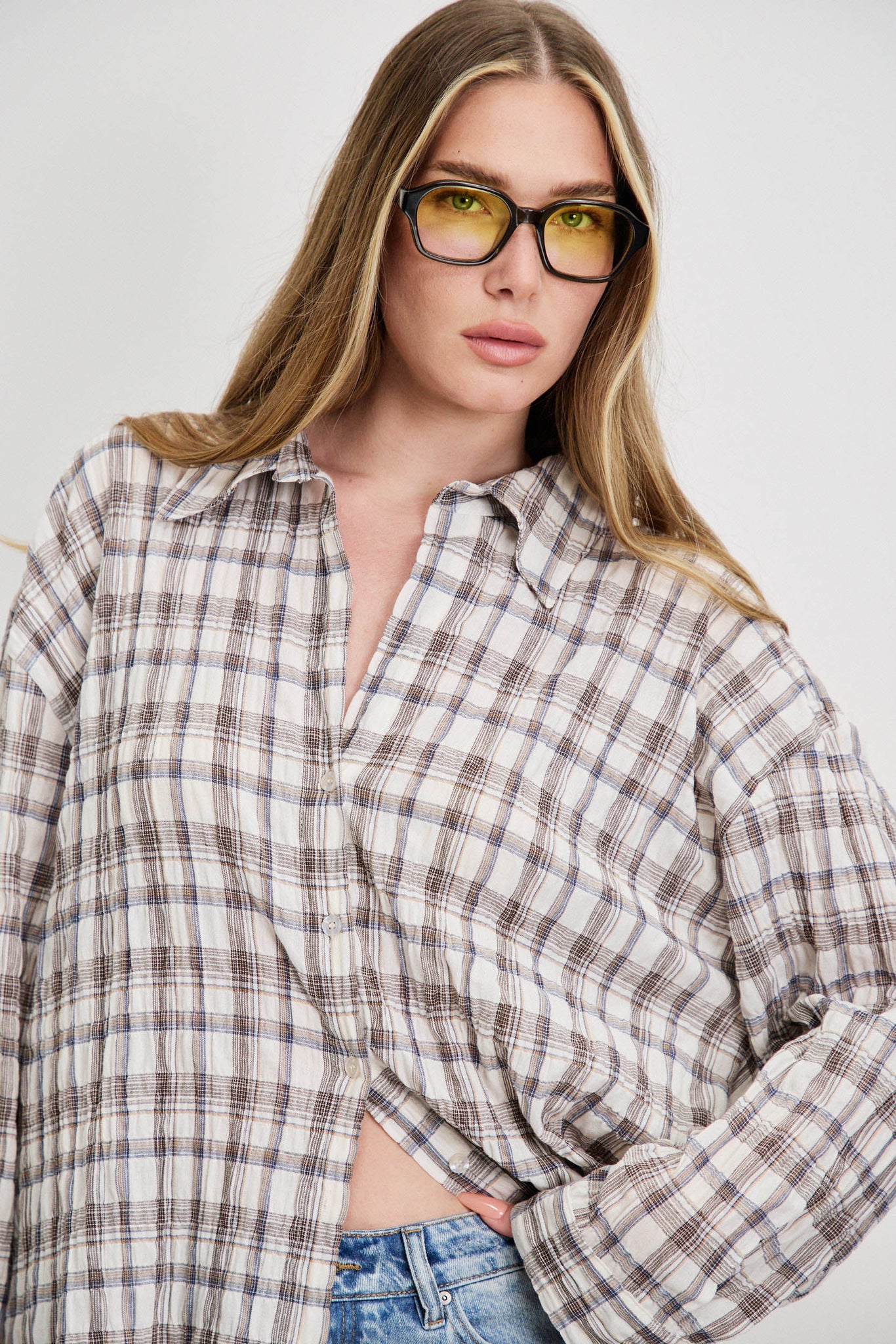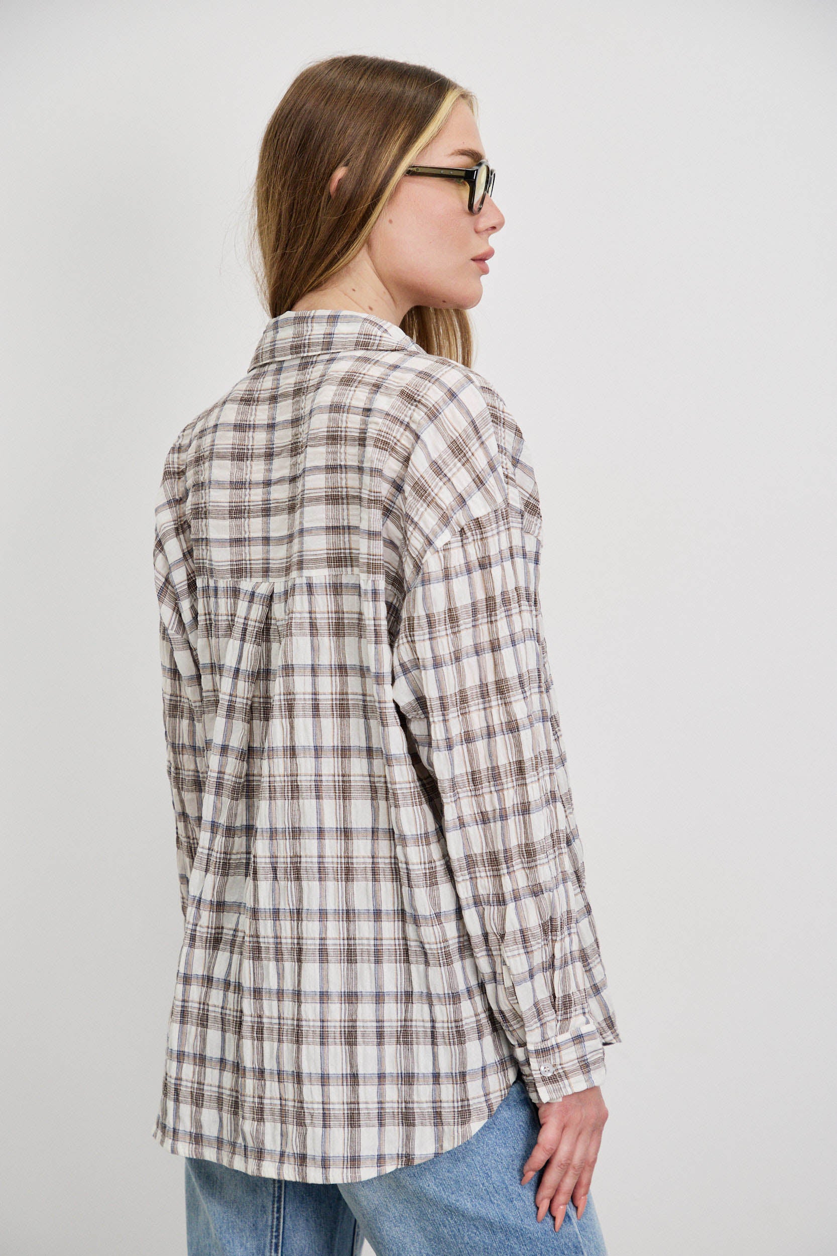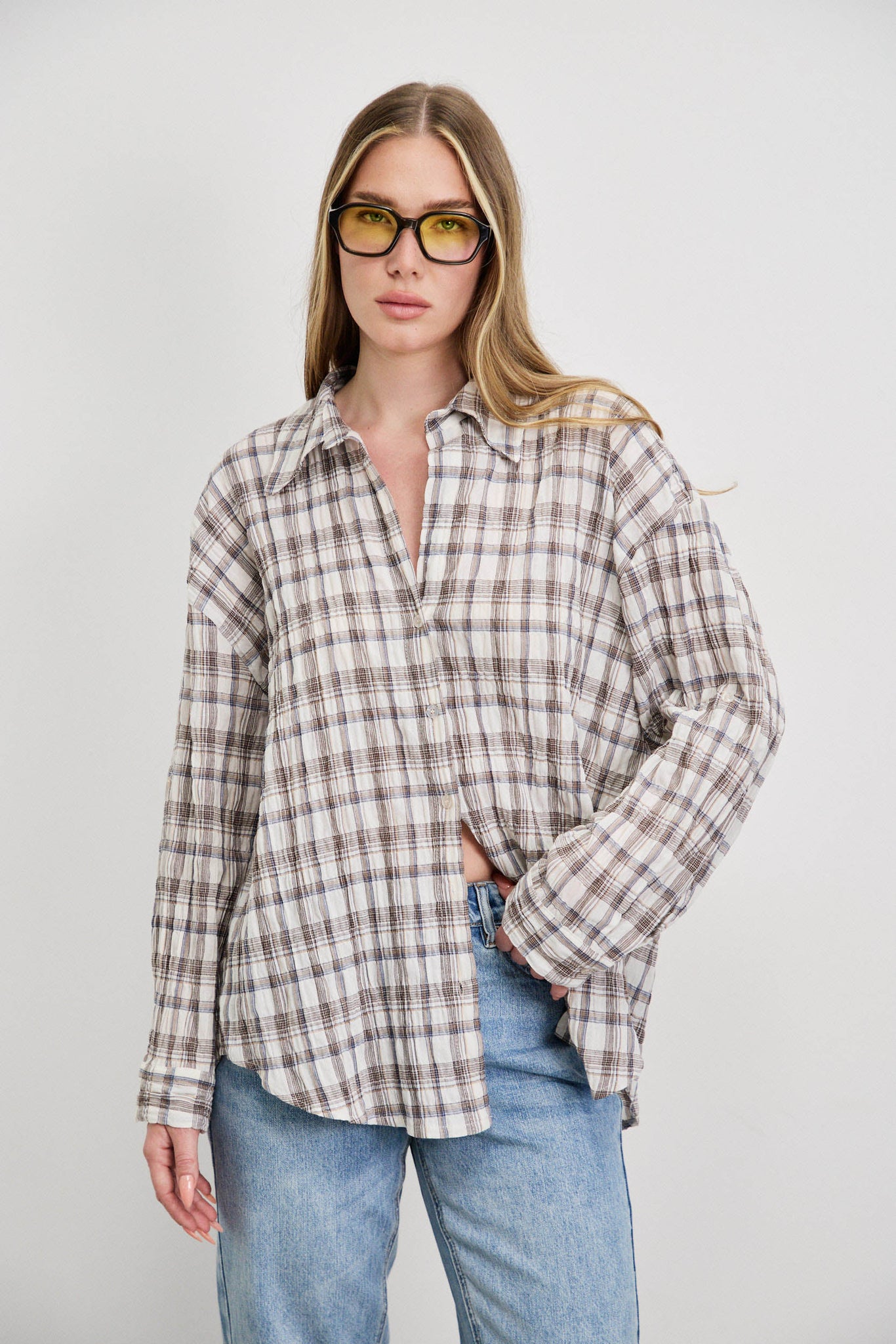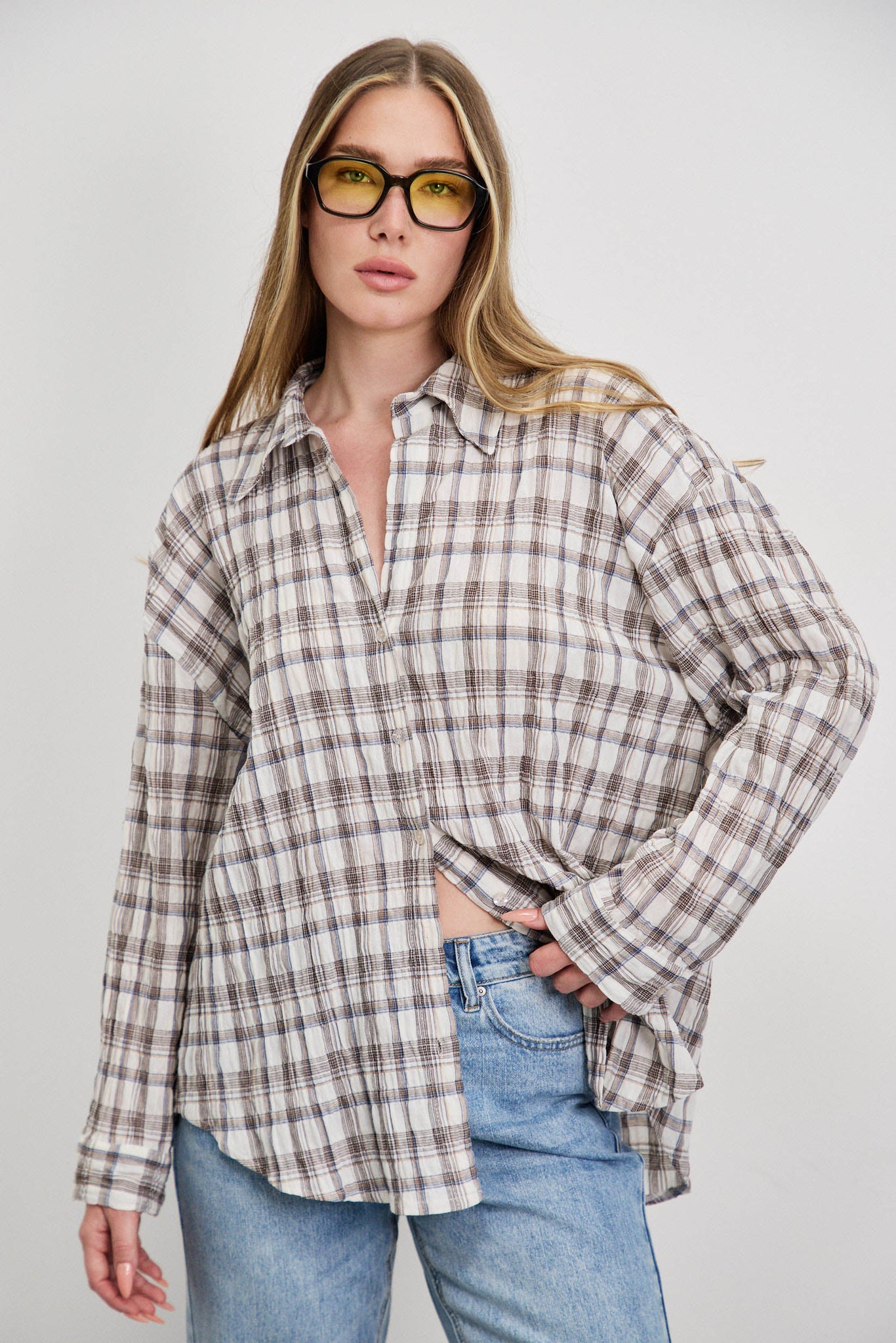 הבד בעל טקסטורה מעט מקומטת בעדינות, שמוסיפה אופי מיוחד למראה ויוצרת לוק קליל, טבעי ועל זמני. זהו חלק מהעיצוב של הבד ומעניק לחולצה את הייחודיות שלה.