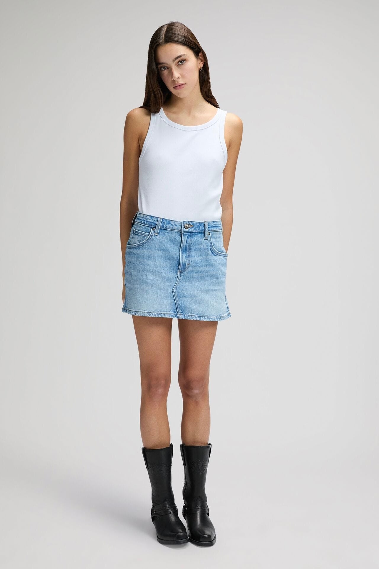 חצאית מיני MINI SKIRT REGULAR ASTER BLUE מבית LEE - חצאית דנים קצרה ואיקונית בצבע כחול ASTER BLUE בהיר ועדין.